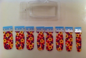 You get 2 little foil packets each containing 8 various-sized nail strips, an instruction booklet, a nail file, and a little orange stick for cleaning up cuticles and sides. Now, here is my top-secret tip. Put away one of the foil packets to save for later, because I am gonna show you how to do this manicure with just ONE of the packets! YAY!