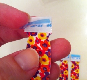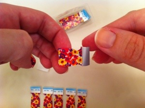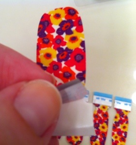 Inside the packet, there are 8 various sized strips. Measure which strip goes on which finger, and lay them out in a row. Set aside the other 3 strips.