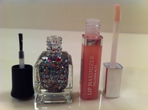I had about 275 points accumulated, so I redeemed by points for a mini Deborah Lippmann Nail Polish in Happy Birthday, which is a gorgeous multi-colored glitter, and a mini Dior Lip Maximizer with Collagen.