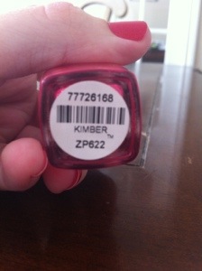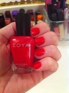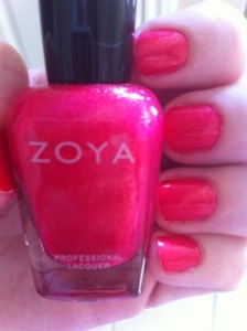 Hi Guys! Today’s mani is a pretty red/pink color with some golden shimmer. This is a very unusual color, because it has some hints of orange to it. This color is called Kimber from Zoya.