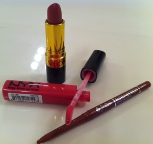 From left to right: Jordana Easy Liner in Tawny, Revlon Super Lustrous in Sassy Mauve, and NYX Megashine in Tea Rose.