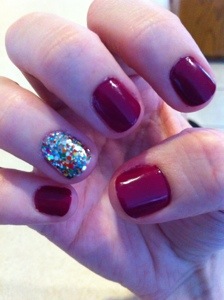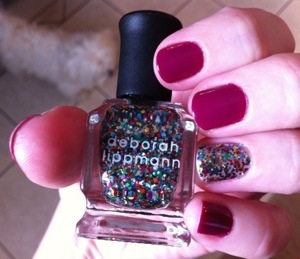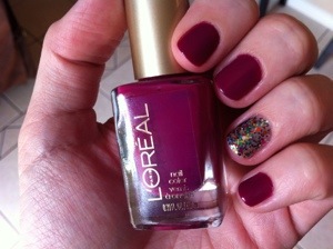 This color is called Violet Vixen by Loreal. I used two coats, and it is very creamy, and did not streak at all. For the accent nail, I layered on about 4 coats of Deborah Lippman’s Happy Birthday.