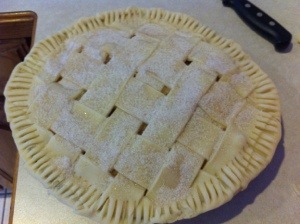9. After you are finished making the basket weave pattern, go around the edges of the pie and trim off any excess pie crust that is hanging over the pie pan. Then, what I like to do is grab a fork and press down the edges, I think it gives a definite crust look to the pie! I also like to sprinkle some cinnamon sugar over the top.