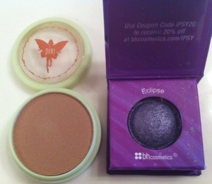 I really like Pixi products, and was glad to see a cheek color in the bag. Personally, I would not use this as a bronzer because it is very light and very shimmery. It will make a nice highlight to use on the tops of my cheekbones, though. I just prefer more matte bronzers, and think they look more natural. They eyeshadow is a really metallic silver-y gray color. It will look really nice on the lid for a holiday look!