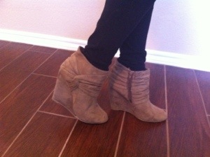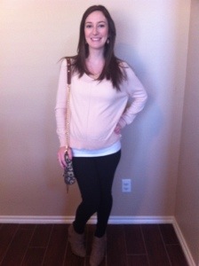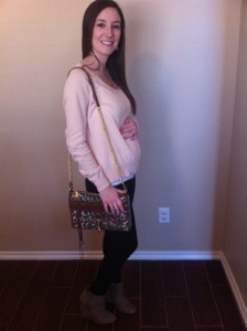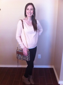 I paired some black leggings with a peach colored sweater that is a little bit longer in the back than the front. I dressed it up a bit with gold jewelry, a leopard bag, and taupe colored wedge booties. Hope y’all like this look!
