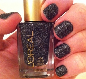 Today’s color is by Loreal, and the color is called Rough Around the Edges. This color is part of the new Gold Dust Collection, and is called a “textured nail color”. What that means is that even if you put a top coat over it, it feels like sandpaper because of all of the glitter pieces. I thought I wouldn’t like the texture, but I actually do! It’s really different and it looks cool.