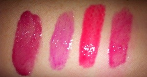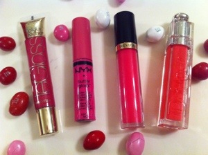 From left to right: Loreal Colour Riche leGloss in Violet Attitude, NYX Butter Gloss in Strawberry Parfait, Revlon Super Lustrous Lip Gloss in Pink Pop, Dior Addict Ultra Gloss in #664 Rose Bikini