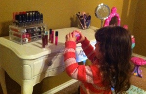 Hey guys! I just had to share this cute photo with you. I walked into my bedroom and saw that my 2-year old had lined up some lip glosses and was using her Disney Princess pretend camera to take a photo. When I asked her what she was doing, she said, “I’m just bloggin’ Mama! This doesn’t look cute, I need to organize these.”