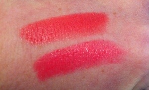 In this photo, the colors look a lot more coral than they are in person. I think that they are VERY similar though, and they look the same on the lips. The MAC one is just a tad but more shinier, though. Here they are on my lips, Revlon Temptress on top, MAC Lovelorn on bottom.