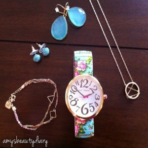Gold and Blue Floral Printed Watch – Ok. This watch just screams me. I am a sucker for anything floral printed, and when I saw this watch I had to have it. I love how it has a stretchy metal band, because I didn’t have to get it sized down like I normally do with watches. I think this watch is so adorable and I plan on wearing it every day. Lol. I picked this up at Macy’s, and it’s the brand Betsey Johnson.