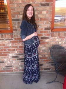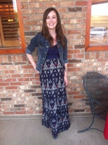 I am seven months pregnant, and I HATE maternity clothes. They are not very fashionable, and they are always huge and unflattering. I just find things that are loose fitting instead of buying maternity clothes. When I am pregnant, the most comfortable things to wear are skirts and dresses, so I chose this navy printed maxi dress, and paired it with a cropped jean jacket and some wedge heels.