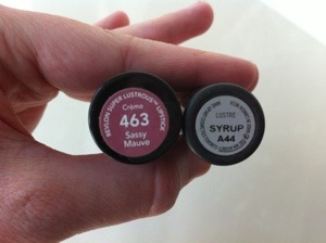 Syrup is a Lustre finish, meaning it does have some shine to it. Sassy Mauve is a Creme, so it doesn’t quite have the shine, but it is definitely gives a satin (not matte) finish. The formula of these Super Lustrous lipsticks are awesome-great pigmentation and staying power, plus no offensive smell!