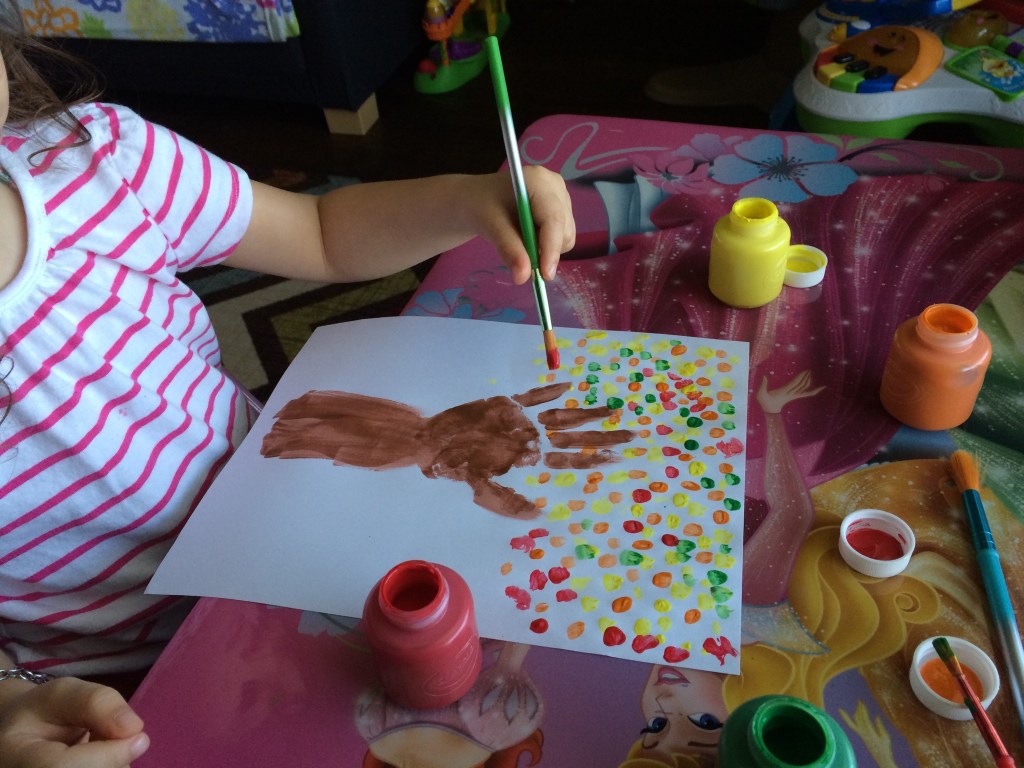 The first thing you’re going to do is paint your child’s arm and hand with brown – this will make the trunk and branches of the tree. Allison loved this part. Then, just put it down on the white paper!