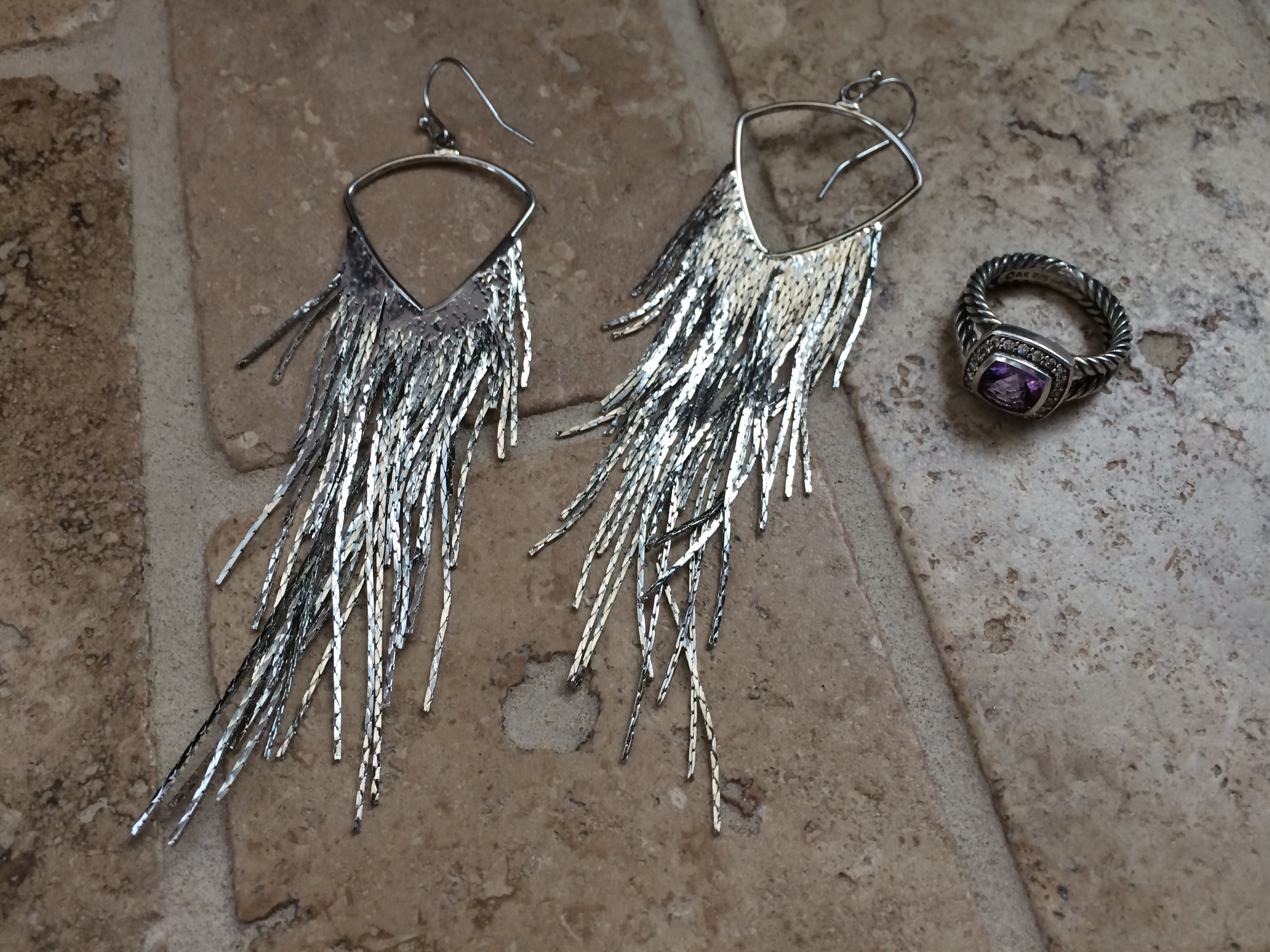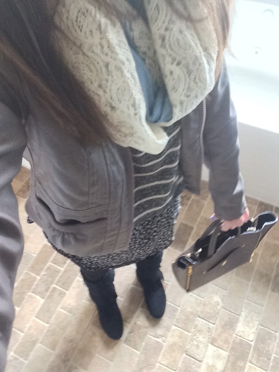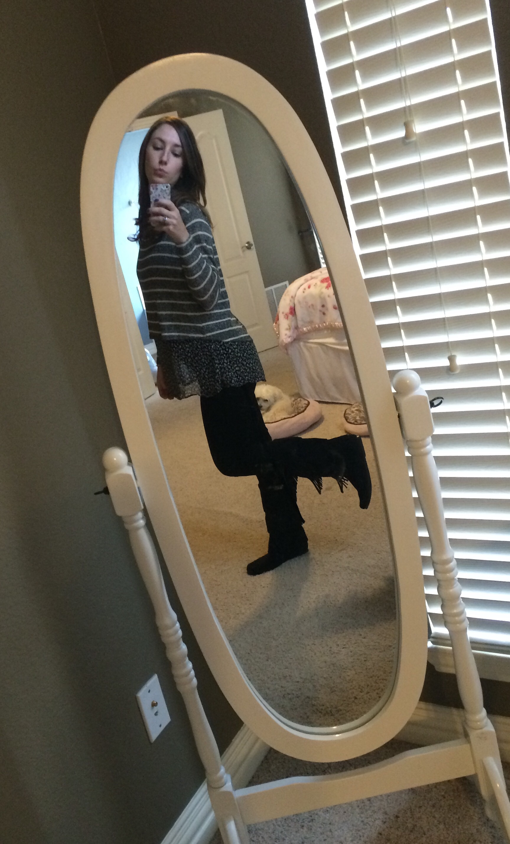 Hi everyone! In the winter, I love to layer. Adding a scarf or a cute pair of boots can dress up an otherwise plain look. Today I paired some black riding pants (they are like really thick leggings with seams going down the legs) with this tunic that is basically two shirts put together. The top of it is striped and the bottom is a floral pattern. To top that off, I am wearing a taupe colored jacket, a blue and lace scarf (gives it some color) and my black fringed boots. The bag that I am wearing just happens to match the jacket perfectly. I kept the jewelry really simple, just a ring and some statement earrings! Hope you like this look!