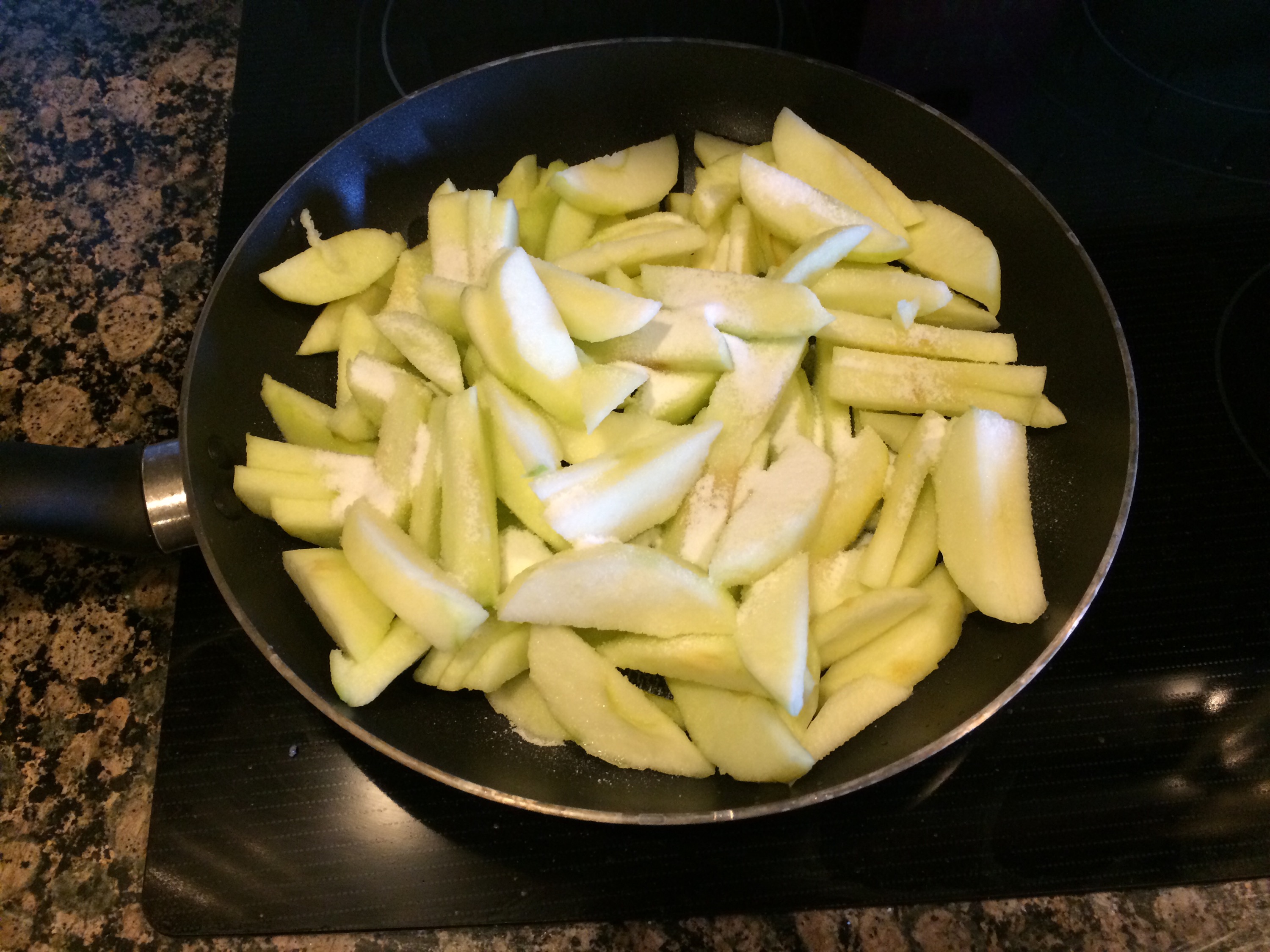 Place all of the apple slices and half of the sugar (3 tbsp) in a pan and turn stove to medium heat. Heat up the apples until they start to soften – about 10 minutes, and then pour the apples into a casserole dish. Set that aside.