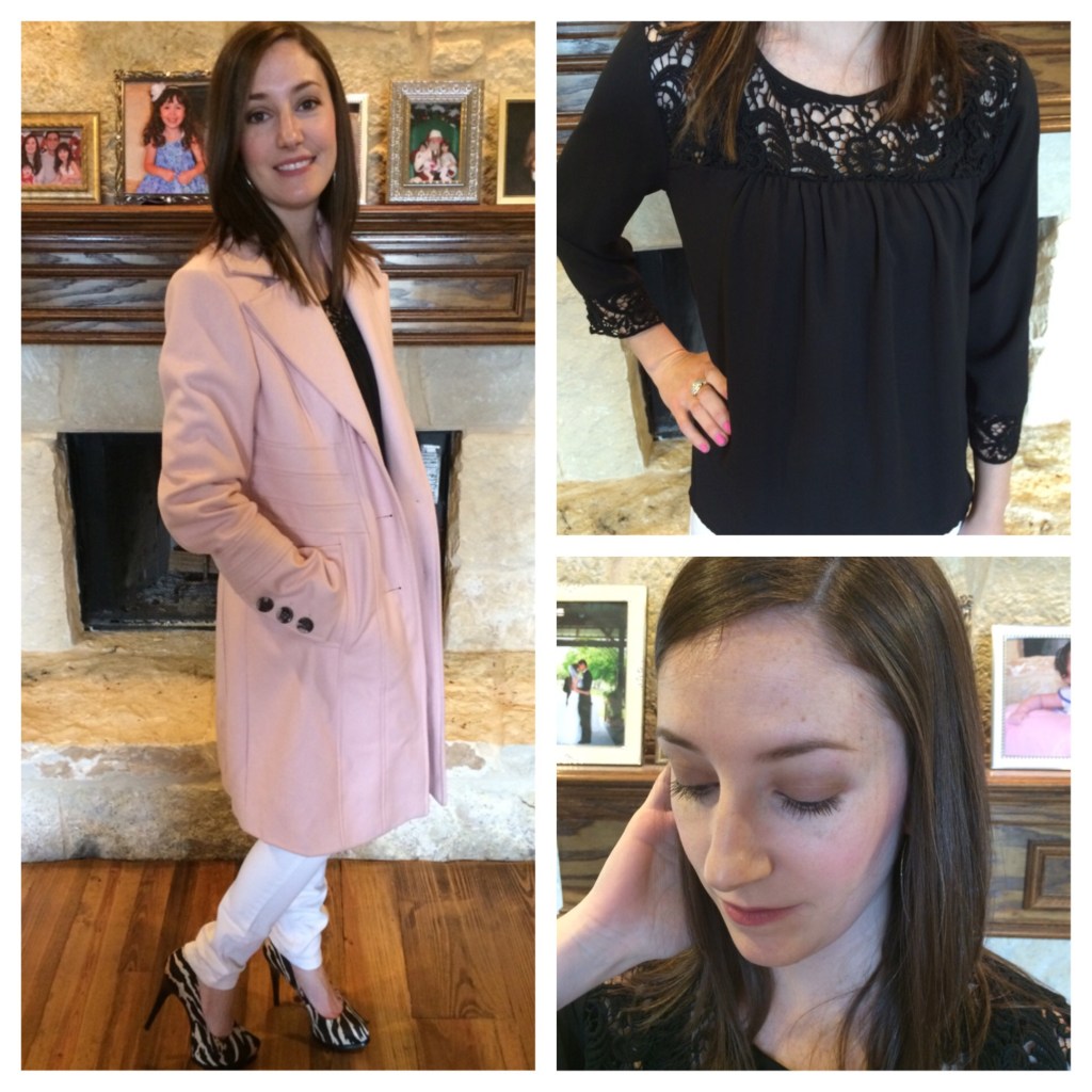 Today’s look is a basic black and white combo, but instead of throwing on a black coat, I thought it would be fun to wear this pink one. Pink is my favorite color and I love how feminine and girly this coat is. I also added some printed heels to dress it up.