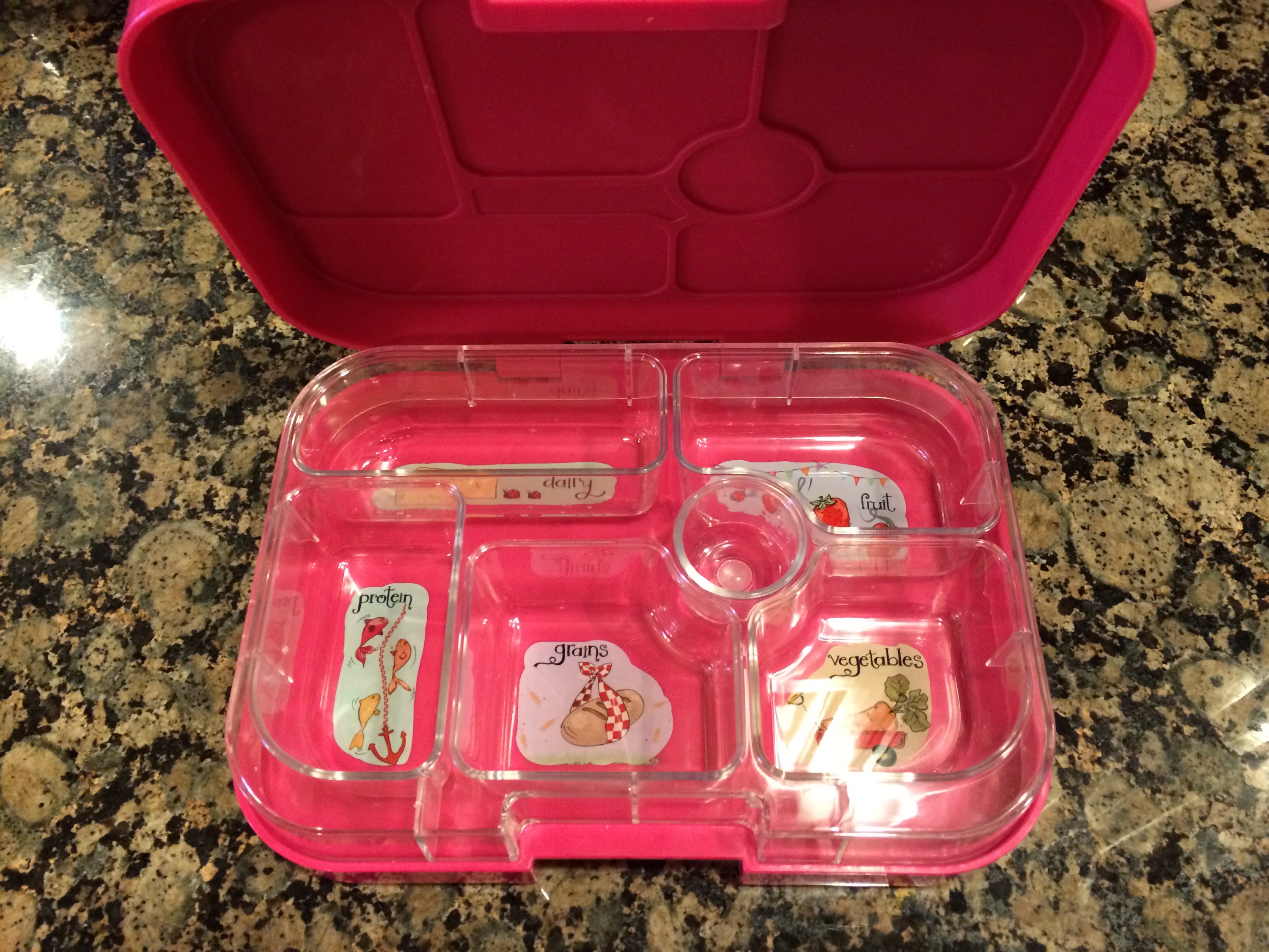 This is a hard plastic lunch container with 6 different sized sections. They come in a variety of colors, but of course, we chose the pink one.