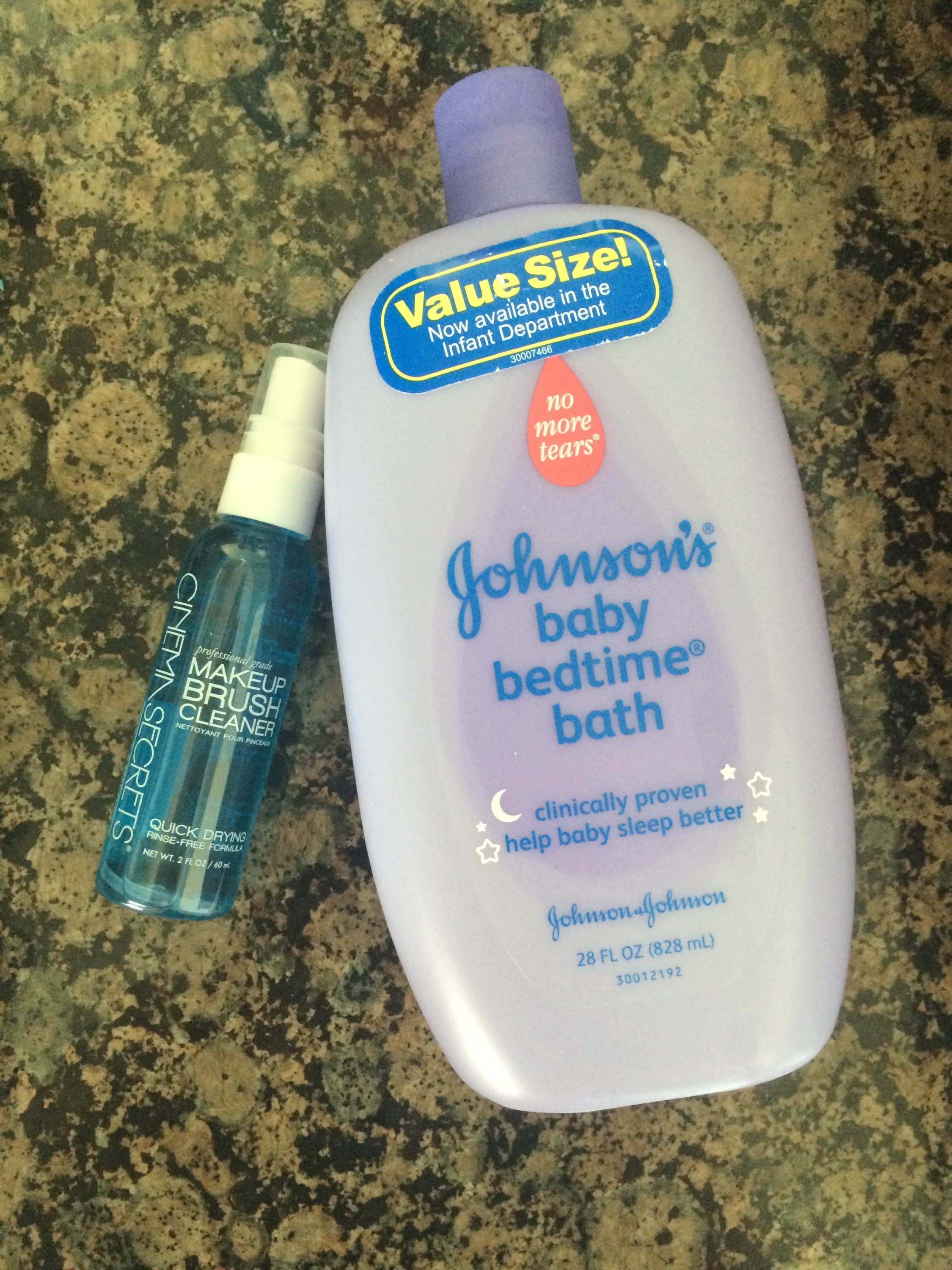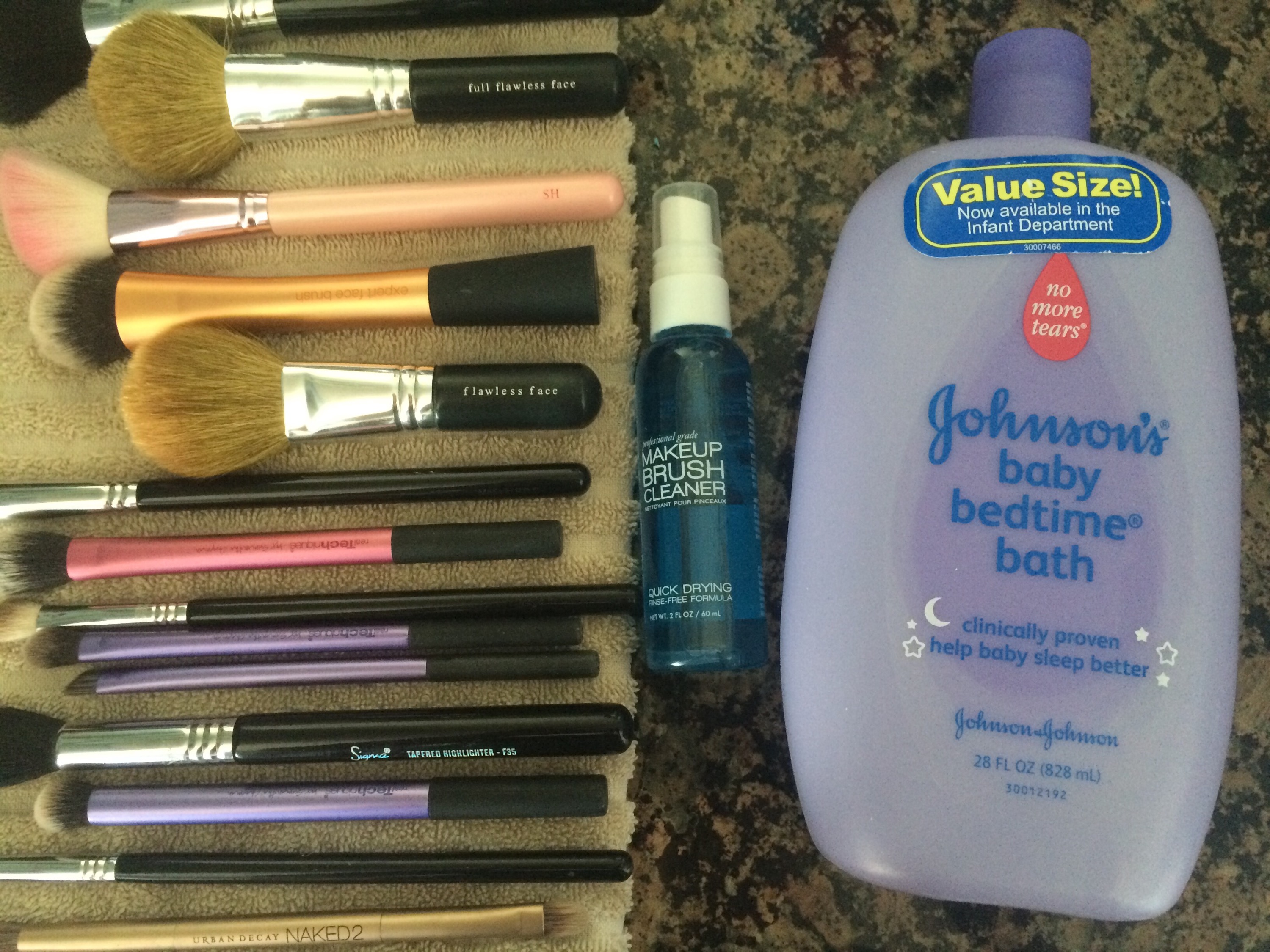 So I try to deep clean my brushes at least once a week.  I said try.  I have a toddler and a baby, so cleaning my makeup brushes isn’t really at the top of my to-do list. lol.  But, the way that I clean them is super simple.  I like to use Johnson’s Baby Shampoo, because it is very gentle, it smells good, and works great to get all of the colors out quickly.  The one pictured is the lavender bedtime soap, but any Johnson’s soap will do.  If you’re a mom, there is a good chance you have some!