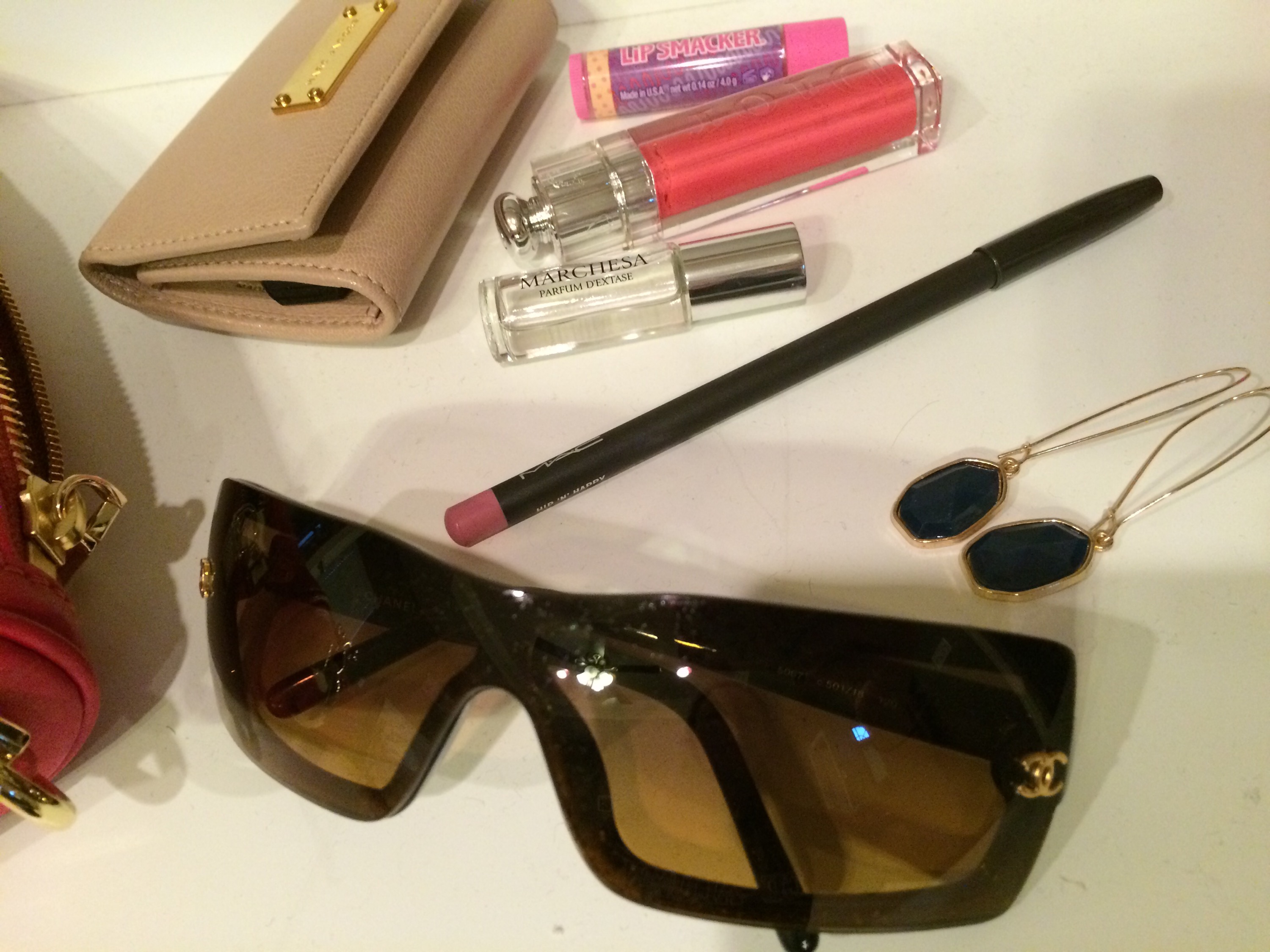 I have this Marc Jacobs Key Holder that is really great because it has little hooks on the inside to hold your keys, and it also holds cards. I don’t like big wallets at all, I like to use tiny ones that just hold a couple of cards and some cash. I’ve also got some Chanel brown sunglasses that have sort of square frames that I’ve been really into lately.