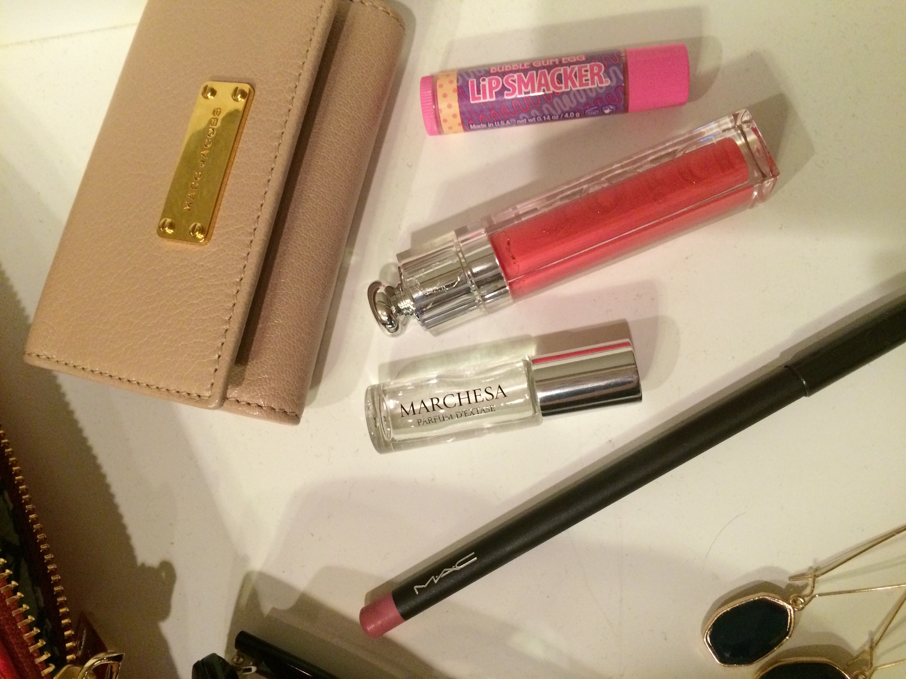 I have a couple of lip products in here. I have Dervish lip pencil by MAC, which is a brown-nude pink, and I have a Dior gloss in 664, which is a sheer hot pink. I also have a Lip Smacker in case my lips get chapped.