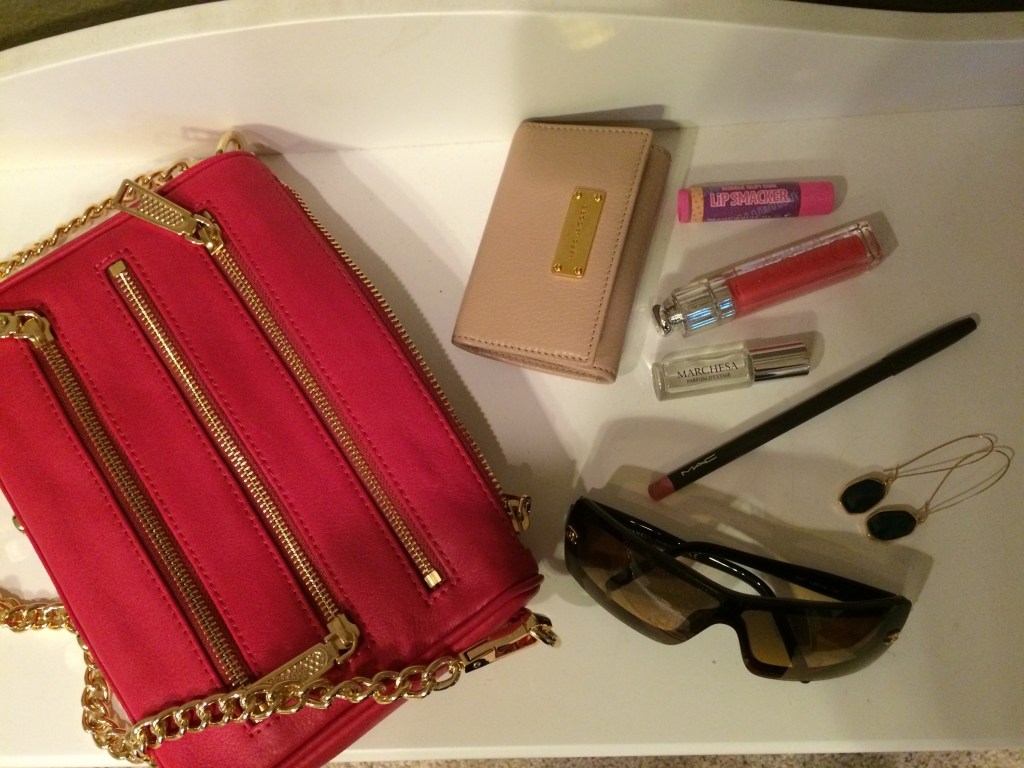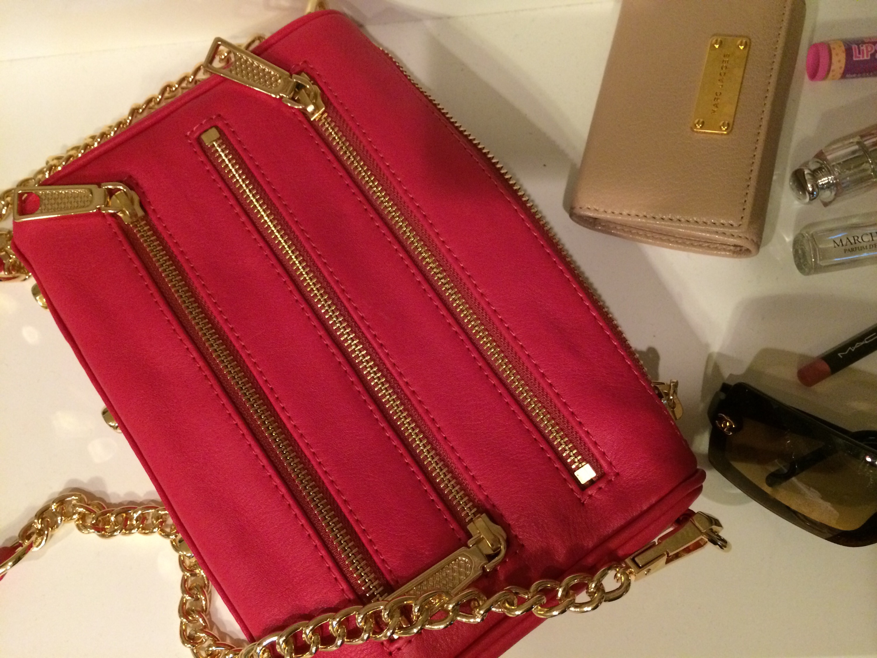 This bag is a Rebecca Minkoff Mini 5-Zip Clutch in Fuschia. I am a huge fan of her bags, and this one actually holds quite a bit.