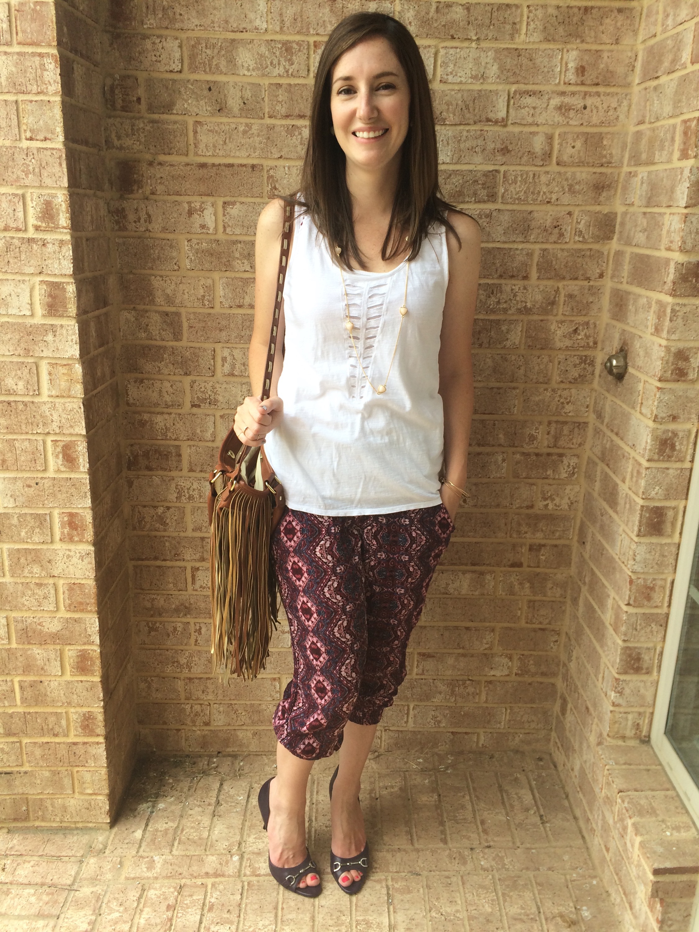 The ones that I am wearing are a pinky-purple color with a print. Since the print is pretty busy, I decided to keep it simple on top with a white tank.
