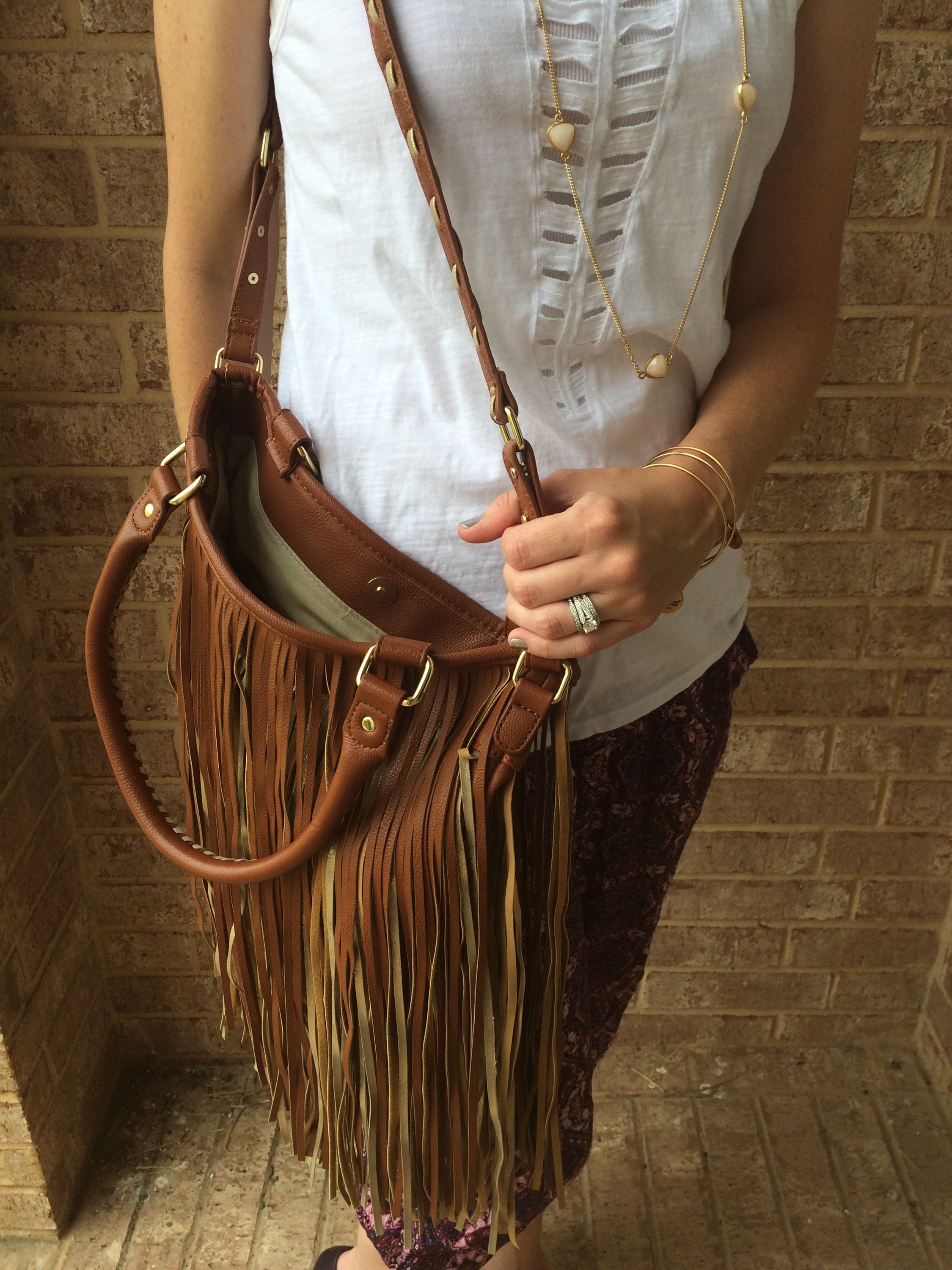 To dress it up a bit, I added some stiletto heels, gold jewelry, and a fringed bag.