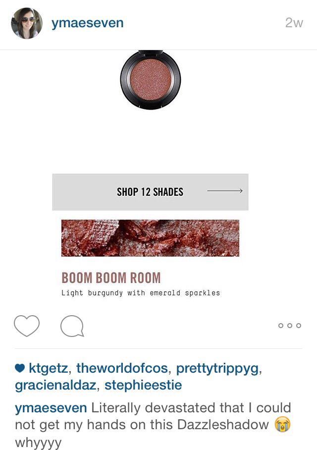I saw a shade that I really liked from their recent LEDISKO Dazzleshadow collection called Boom Boom Room. If you follow me on INSTAGRAM, (which you totally should) you will remember when I posted about missing out on this shadow. I was devastated, I went to 3 different MAC stores trying to find it.