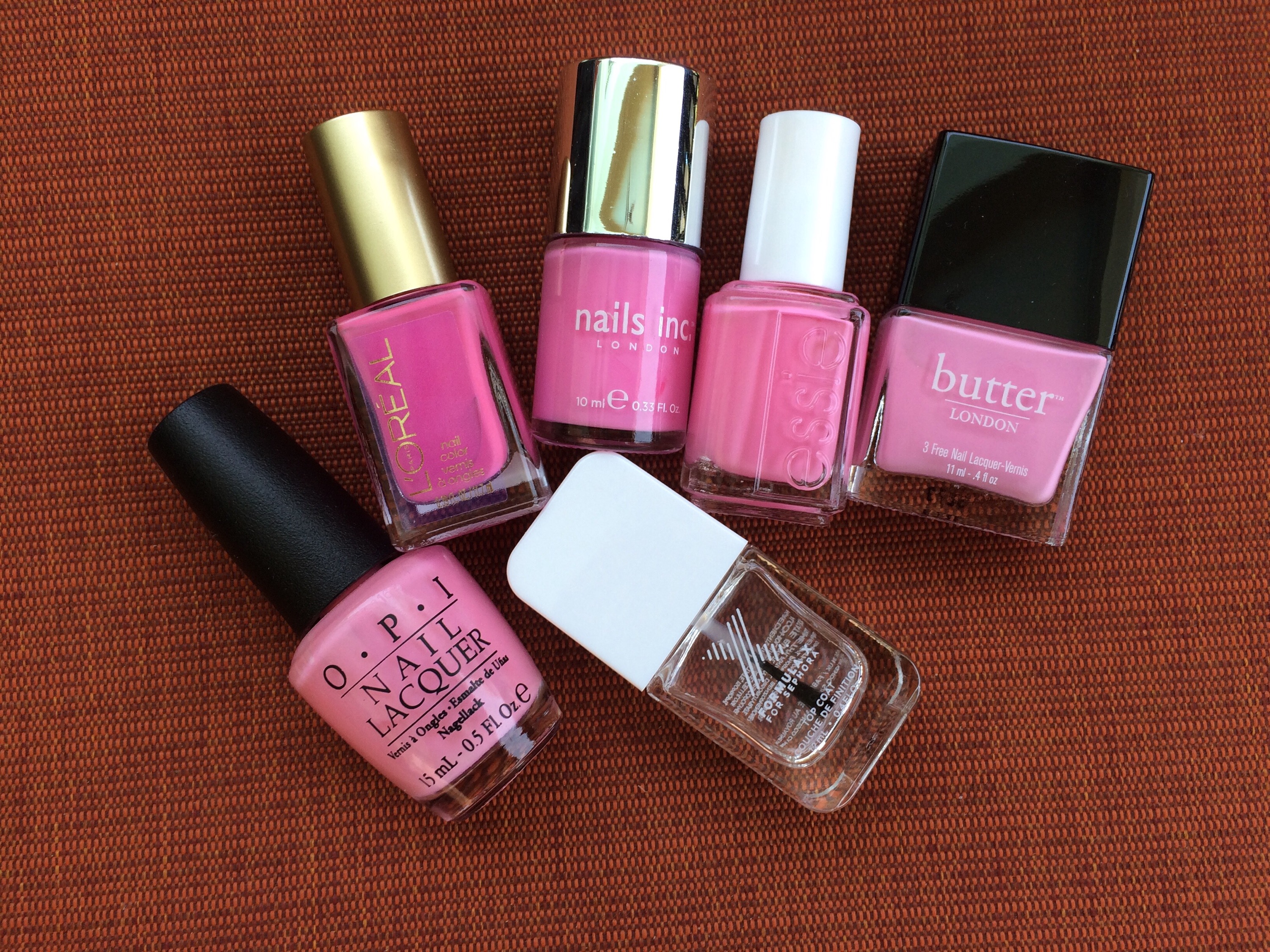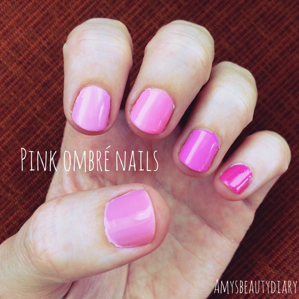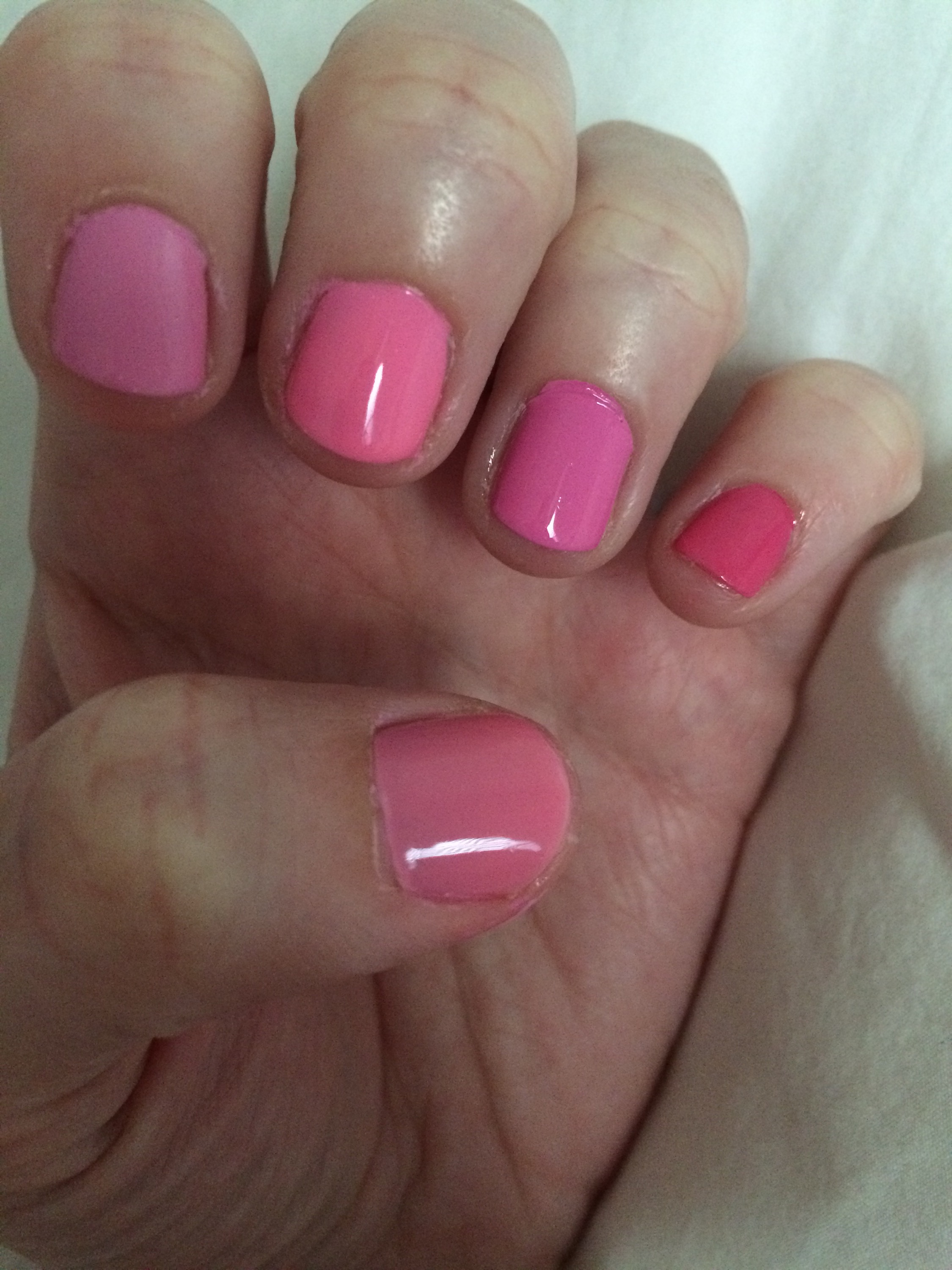 My favorite color of nail polish, and just my favorite color in anything, is pink. I love pink because it is feminine, girly, pretty and fresh. I have a lot of pink nail polish, as you can imagine. I thought it would be fun to paint each nail a different shade of pink, going from light to dark – ombré as they call it.