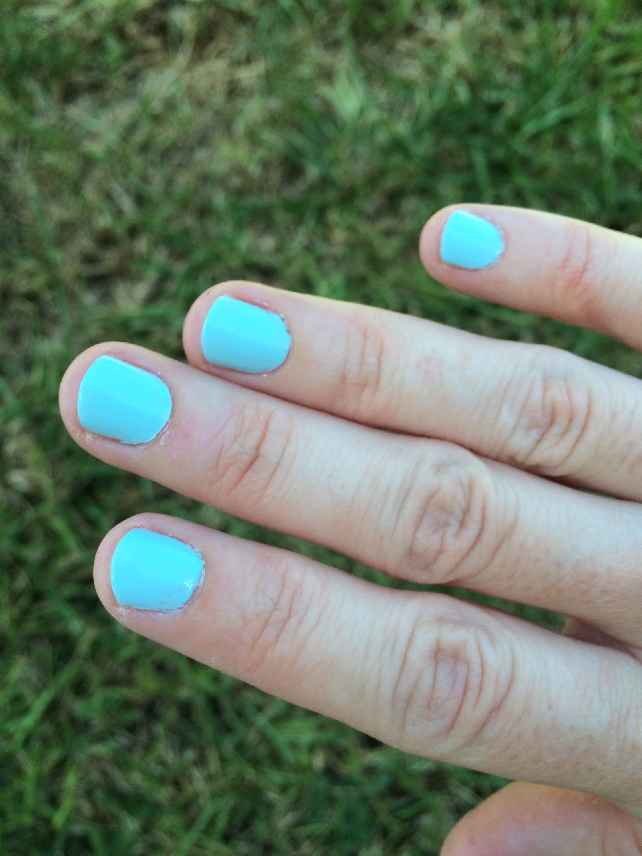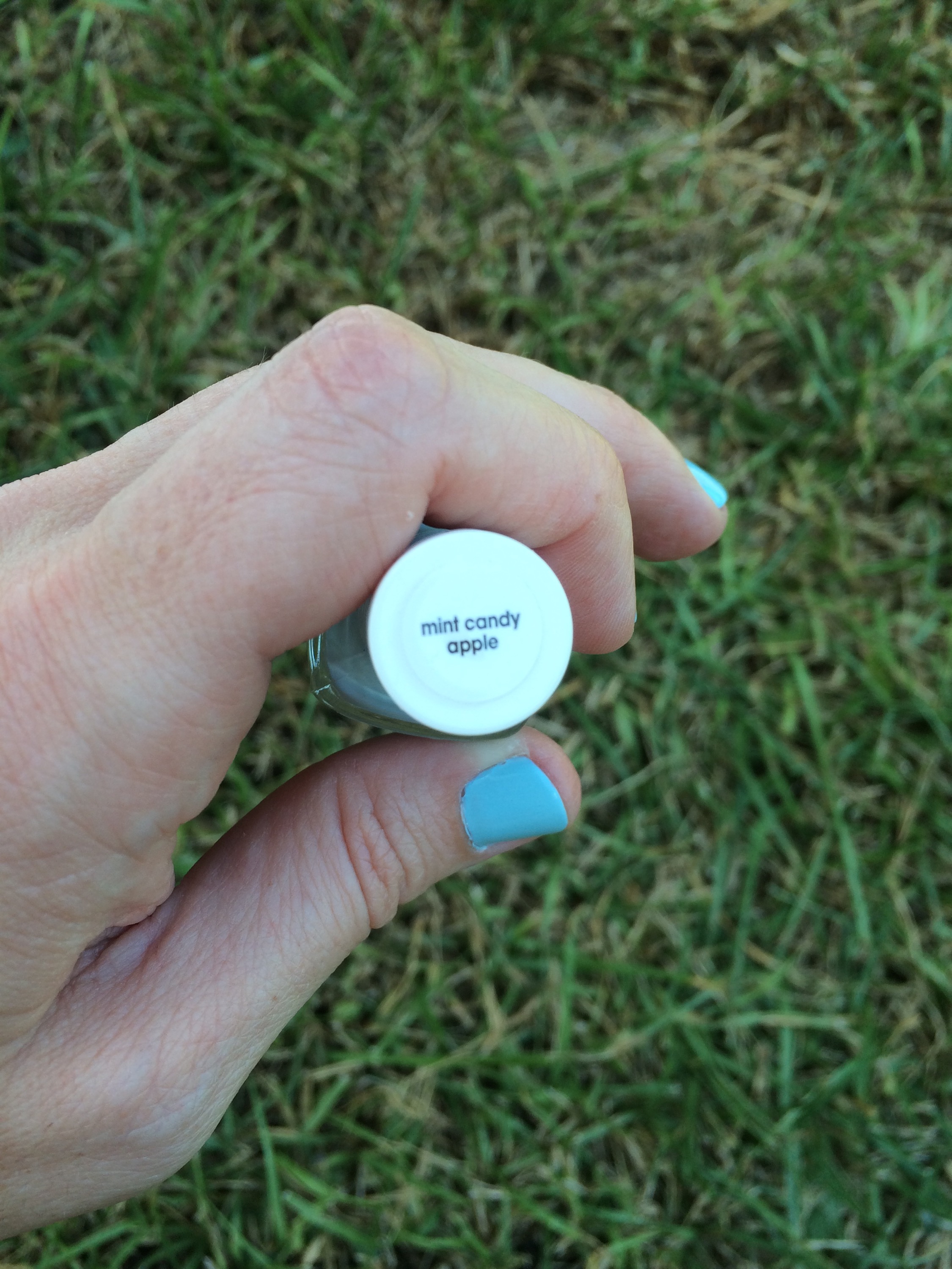I’m not sure why this polish is named Mint Candy Apple, because when I think of mint, I think of light green. This is a true bright (but light) blue . It’s absolutely gorgeous and even better in person.