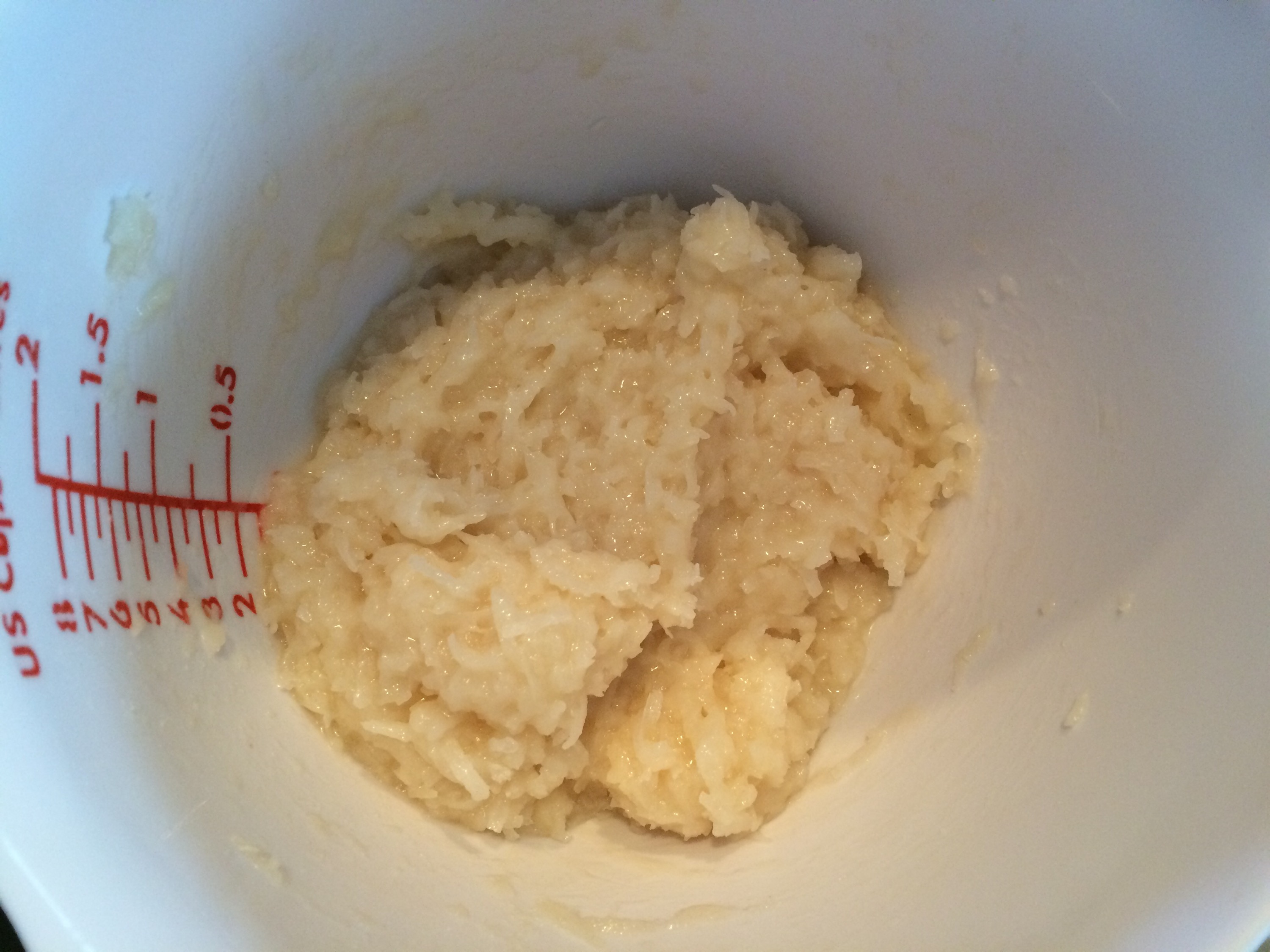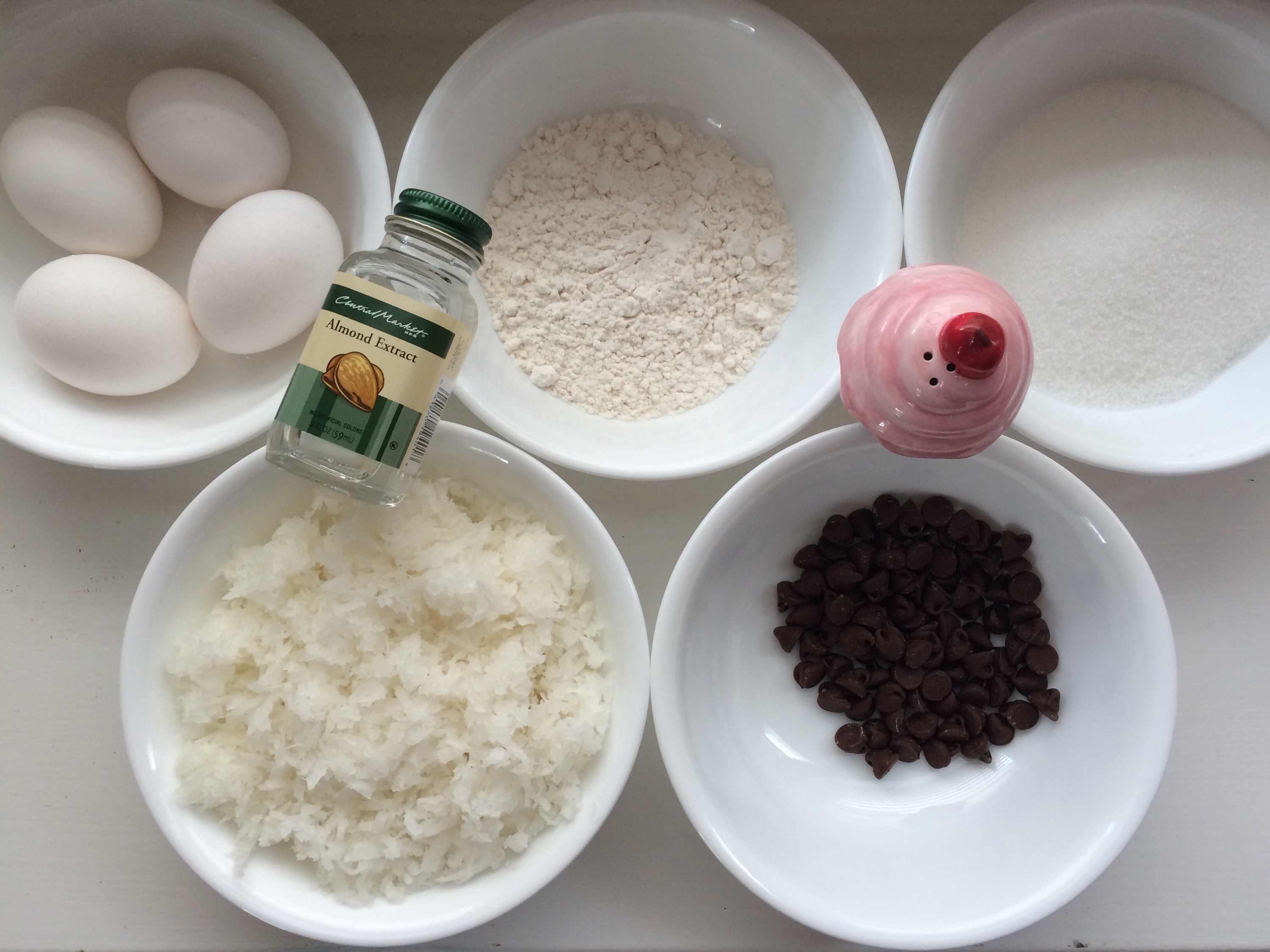 Preheat oven to 325 degrees. In a mixing bowl, combine coconut, sugar, flour, and salt.