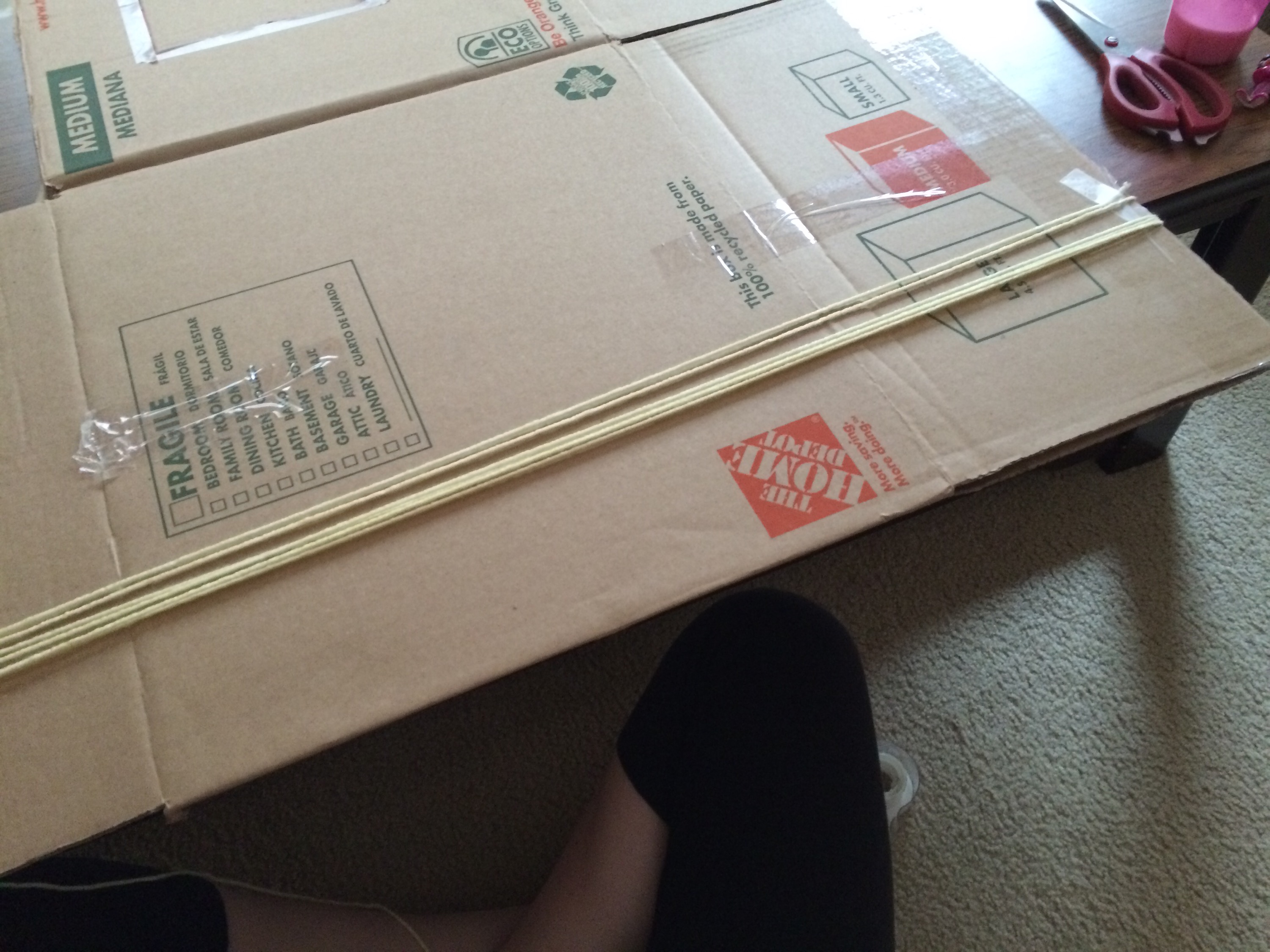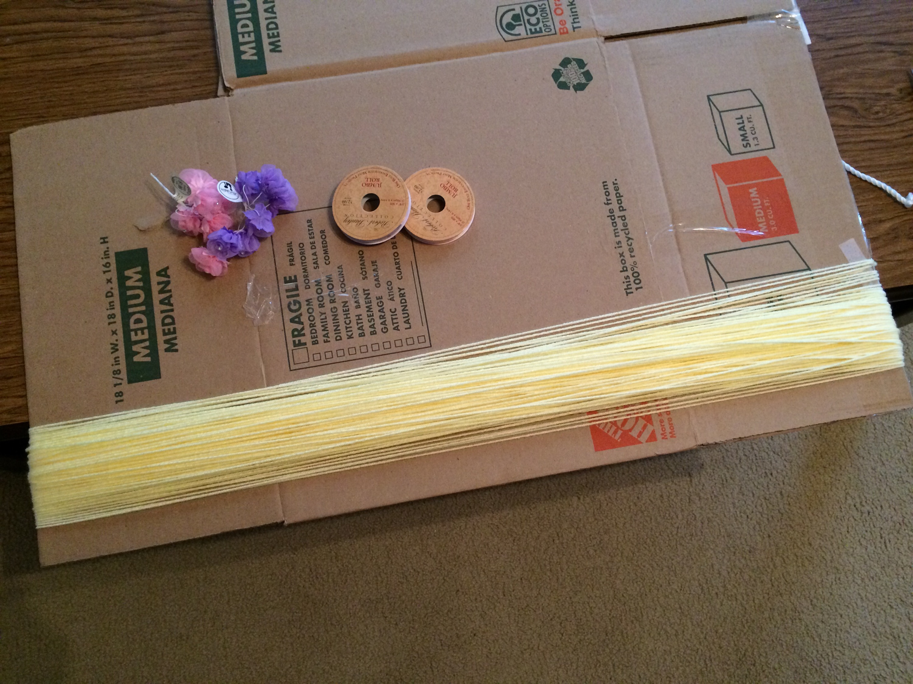 You’re going to start off with taping the end of the yarn to the large piece of cardboard. Pull the cardboard to the edge of the table, and start wrapping the yarn around. You are going to wrap the entire thing of yarn around this board.