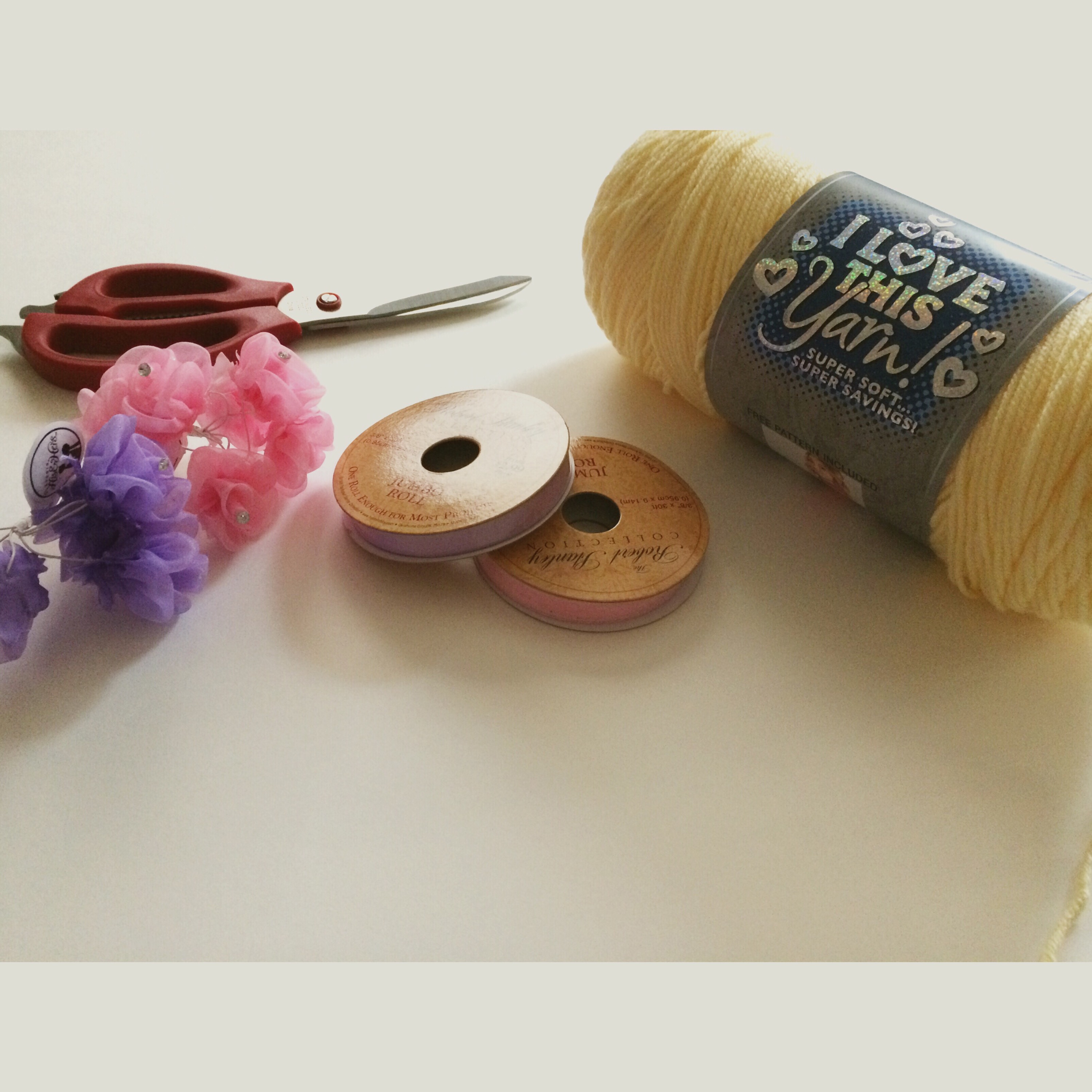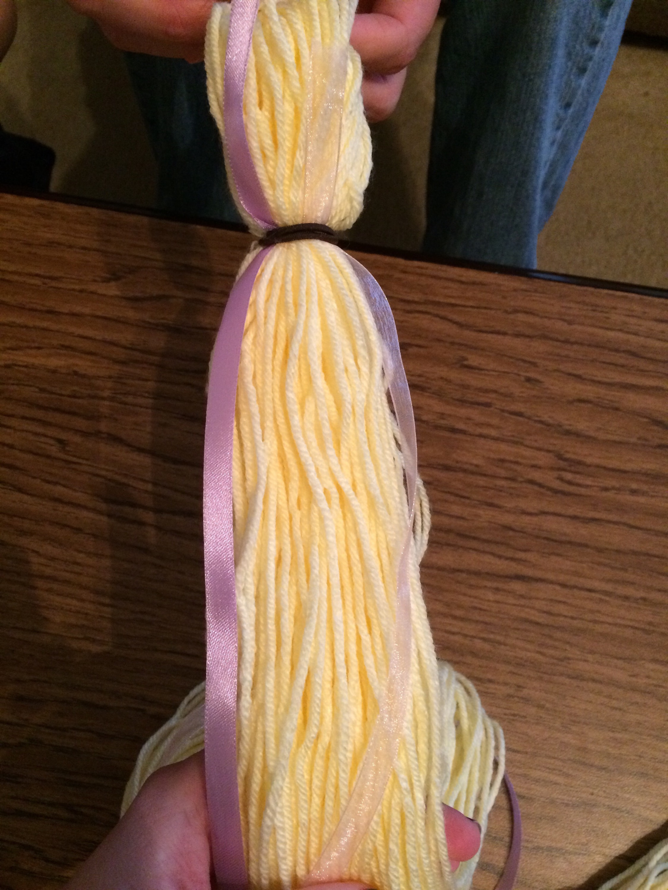 Secure the top of the yarn with a ponytail holder, and thread some ribbon through the top going all the way down the yarn.