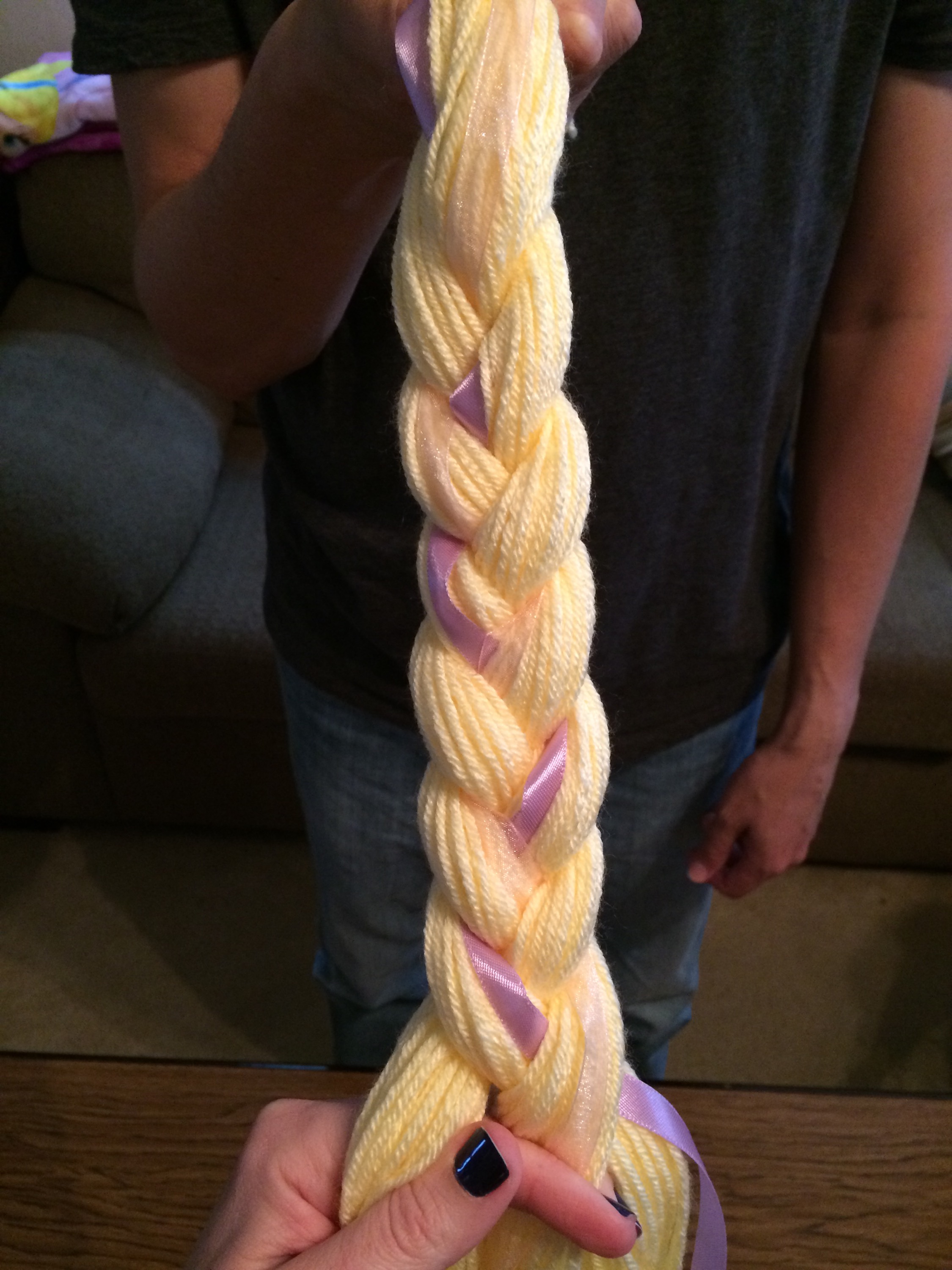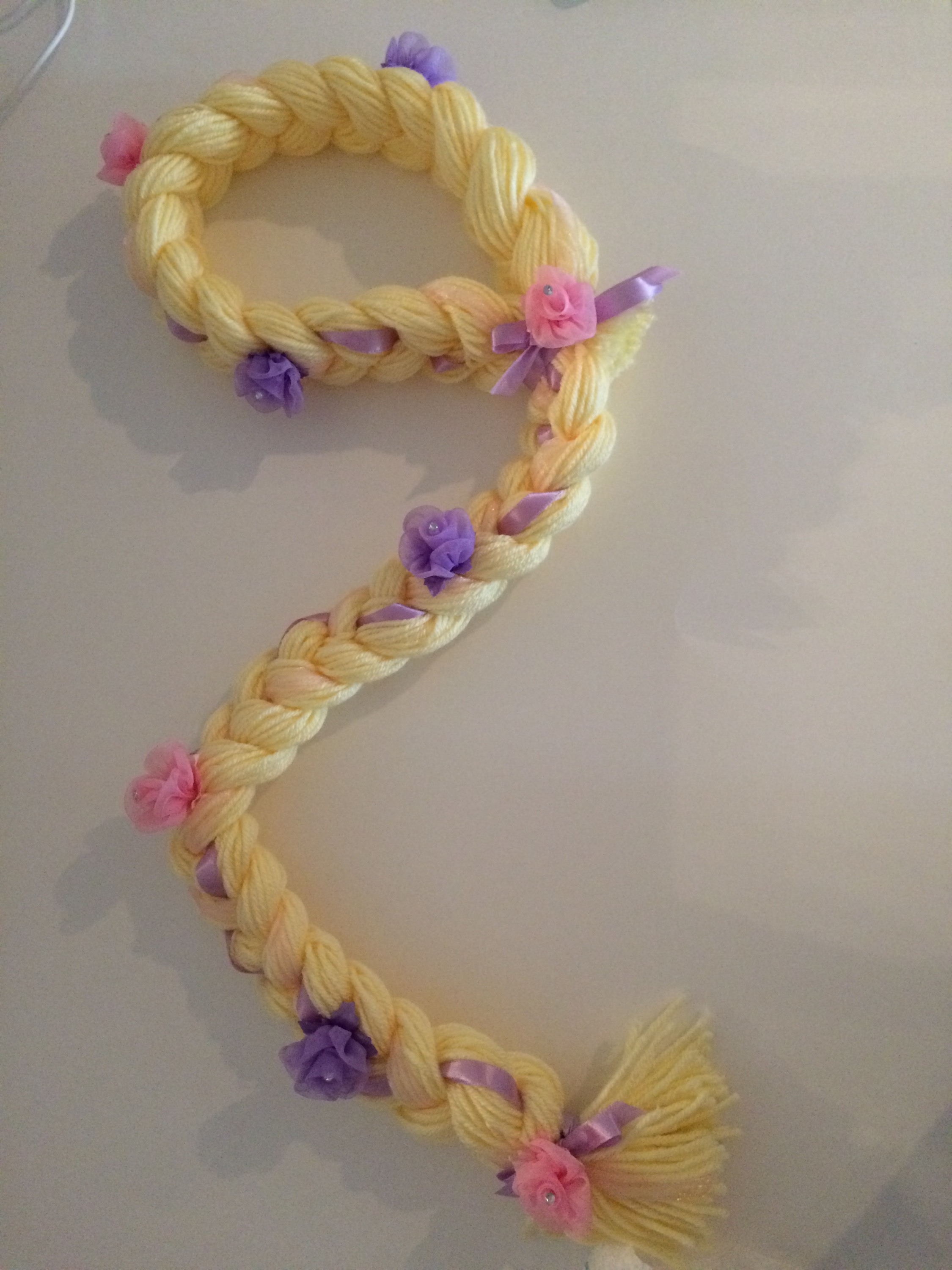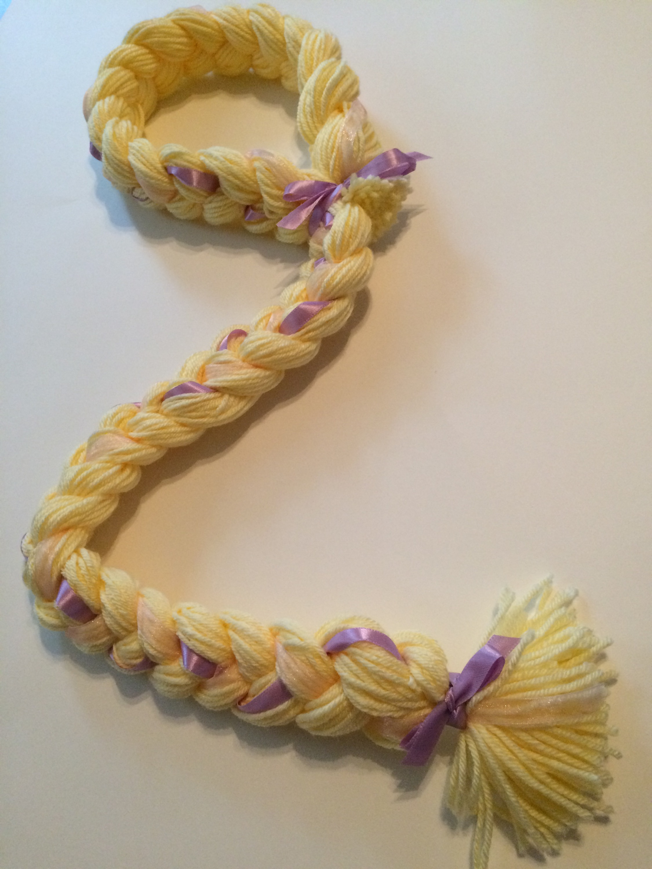 I came across a few pictures of these hair braids that you can make from yarn online. I saw a Rapunzel colored one, but this could also work great for an Elsa costume! Just change the colors of yarn and ribbon, and you have an Elsa braid. Maybe we will do that next year, she hasn’t gone as Elsa yet!