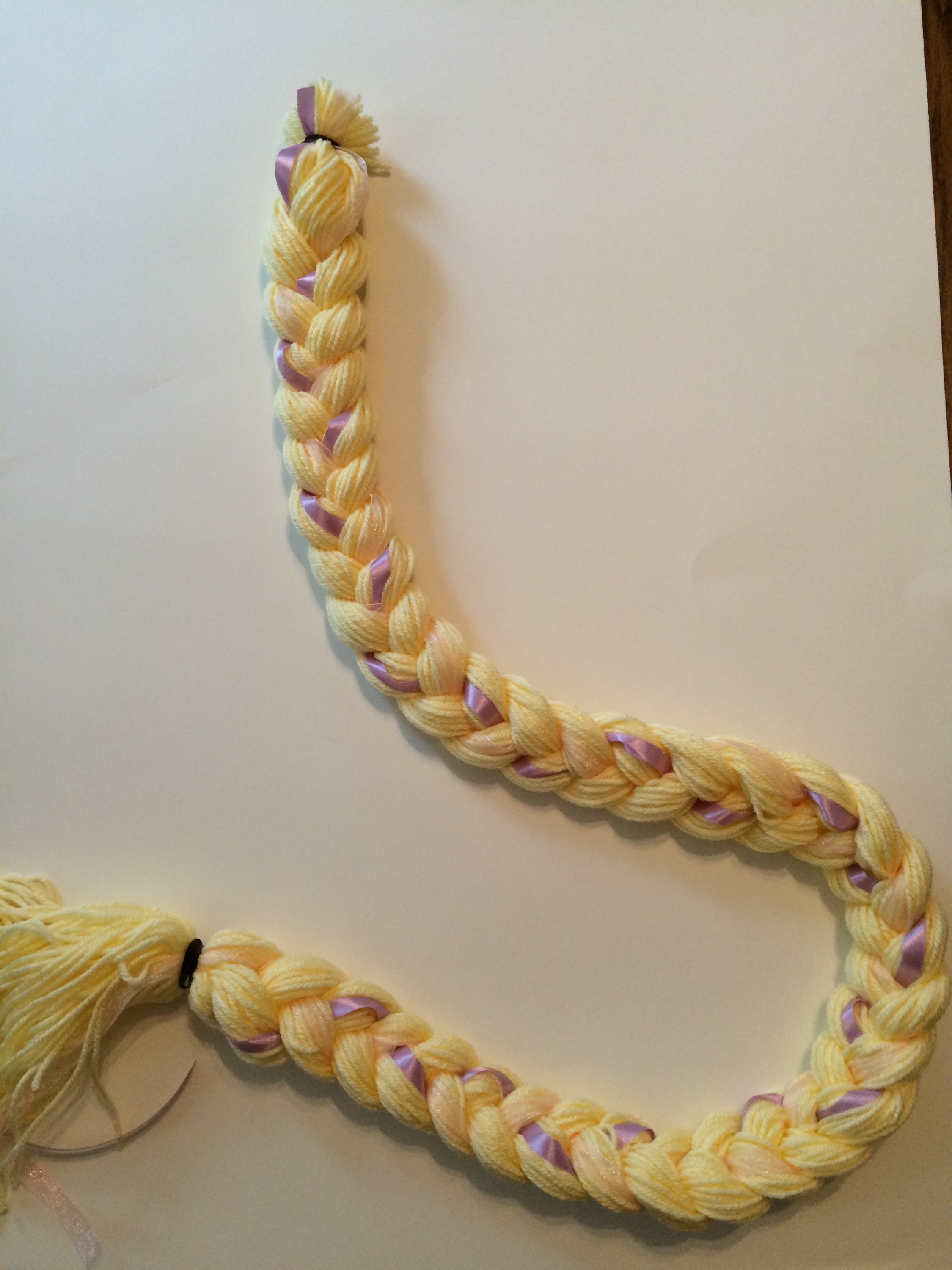 Another Halloween, another Disney Princess costume. This year I’ve got two princesses, My four year old Allison wants to be Rapunzel, and my 16 month old Ashley is going to be Snow White. While we were picking out costumes, I saw a couple of Rapunzel hair options – which weren’t that great, so I decided to make my own.