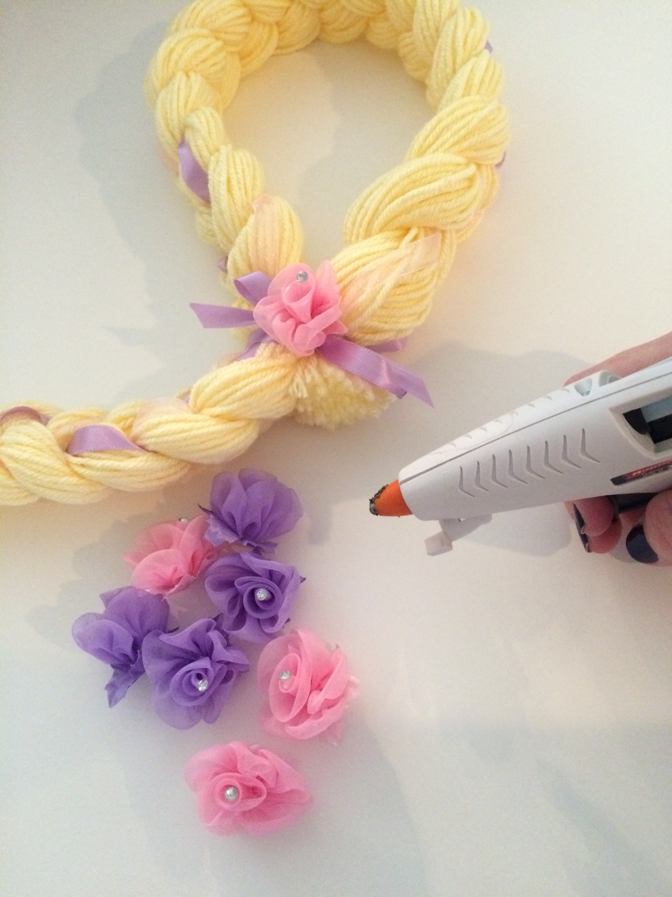 Using your glue gun, glue on the flowers and any other embellishments that you want to add.