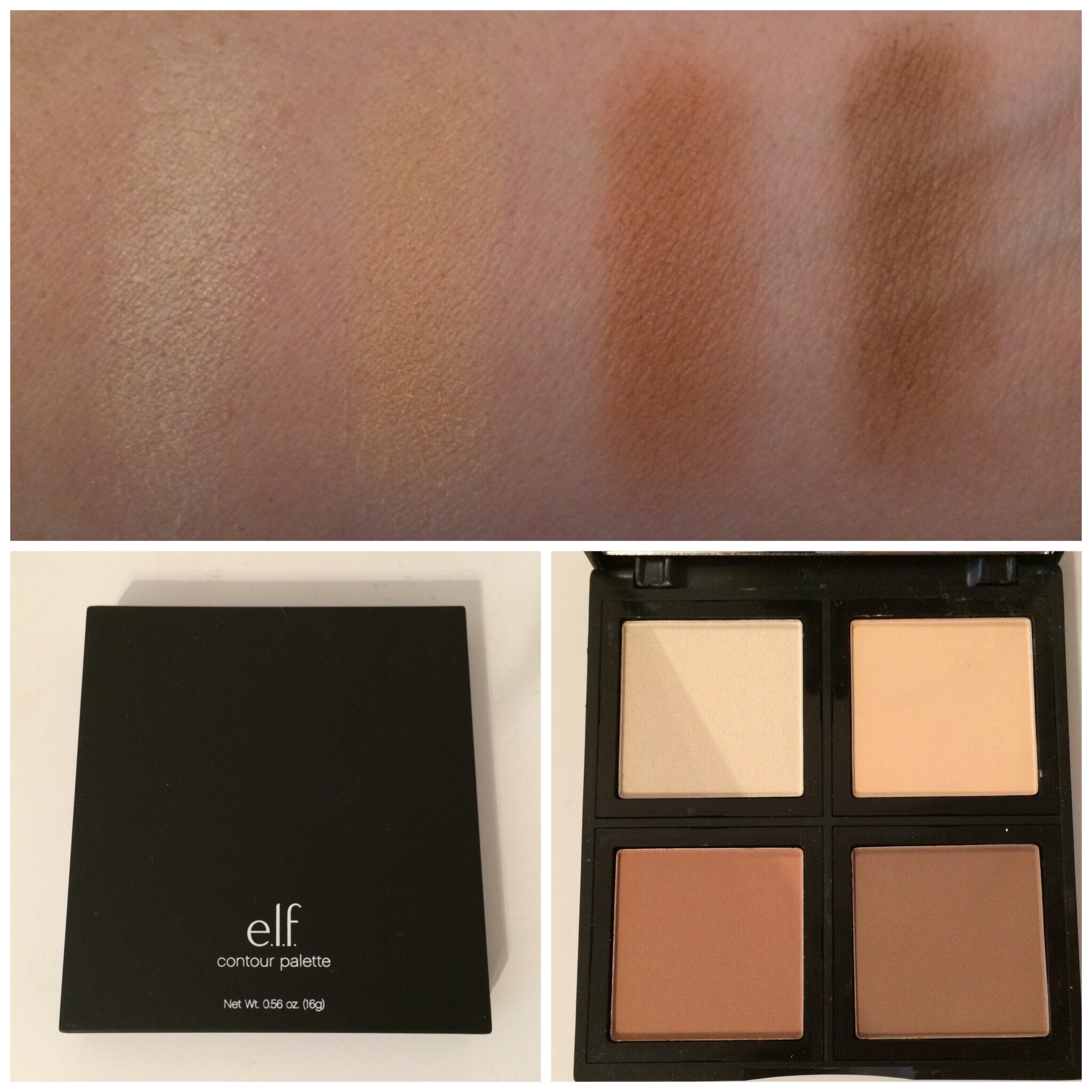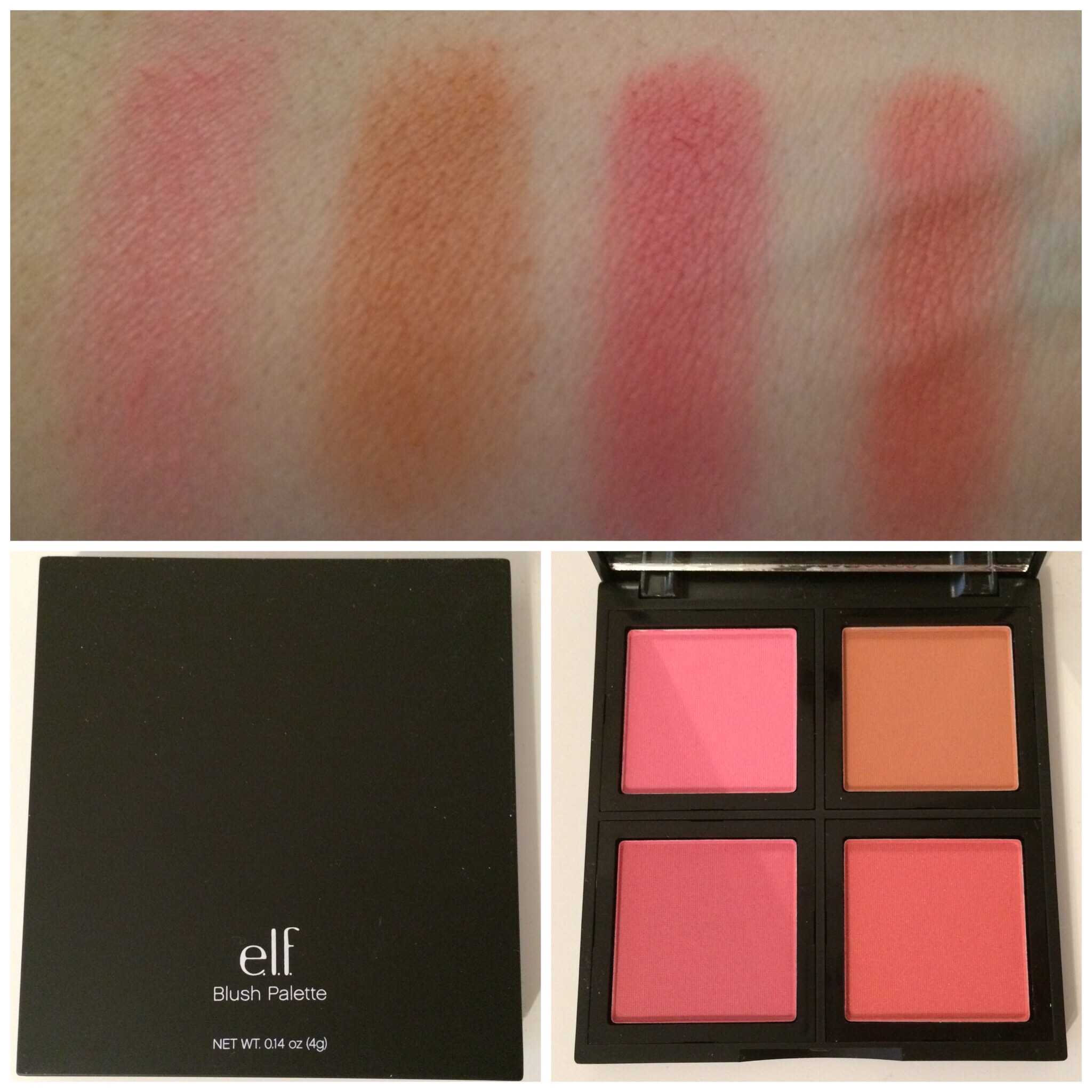 All of the colors in this palette are matte, except for the bottom right color (last swatch). These are pretty pigmented, I was surprised at how well they swatched. ELF did a great job of choosing colors for this palette, first color is a baby doll pink, second color is a peachy- pink, and then on the bottom you have a cool deeper pink, and then a warmer toned, shimmery pink. These are all gorgeous colors, especially that last color (bottom right).
