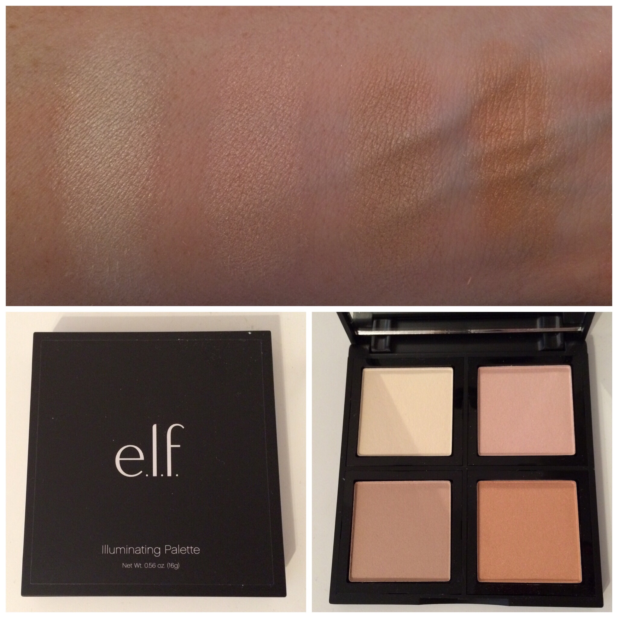 I was most excited for this one. All of the colors here have a sheen to them to give you a nice glow to the skin. No glitter, just a fine shimmer. The first shade is a yellow champagne toned color, verrrry similar to the first one in the Contour Kit. The second one is a pinker-champagne tone. The third one (bottom left) is a light gold, and then the last one (bottom right) is a warmer, deeper gold color. These are beautiful, and they remind me a lot of the Hourglass Ambient Lighting Powders.