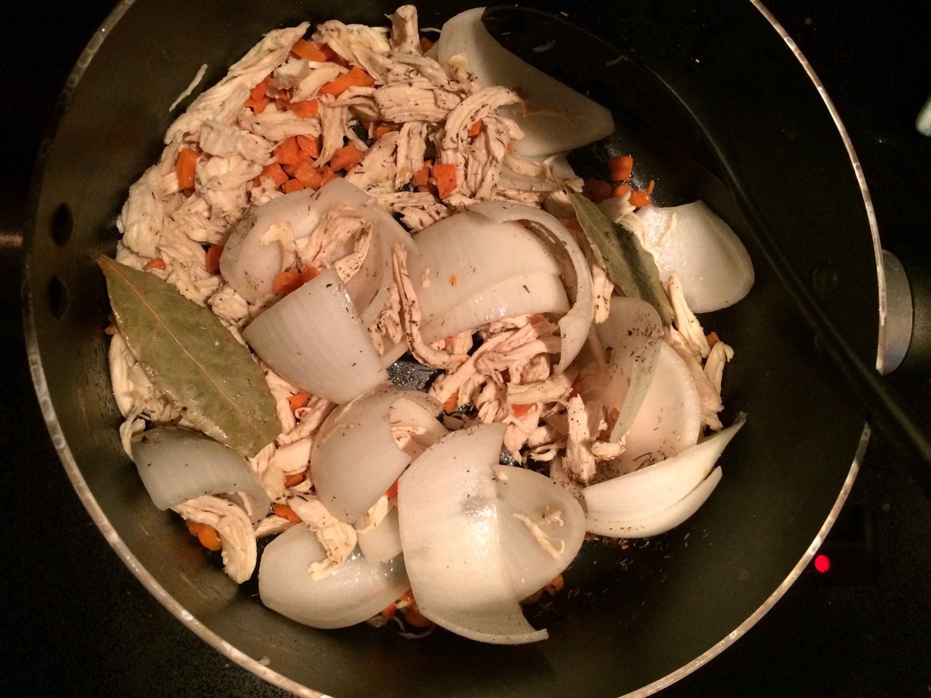 Add shredded chicken and sauté.  Stir in bay leaves, salt, pepper, sage, and thyme.