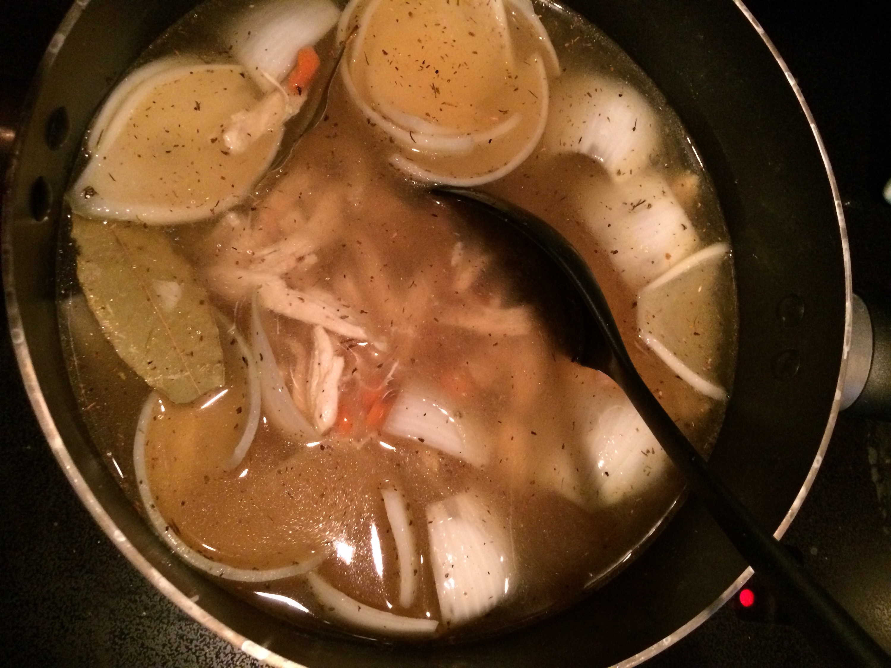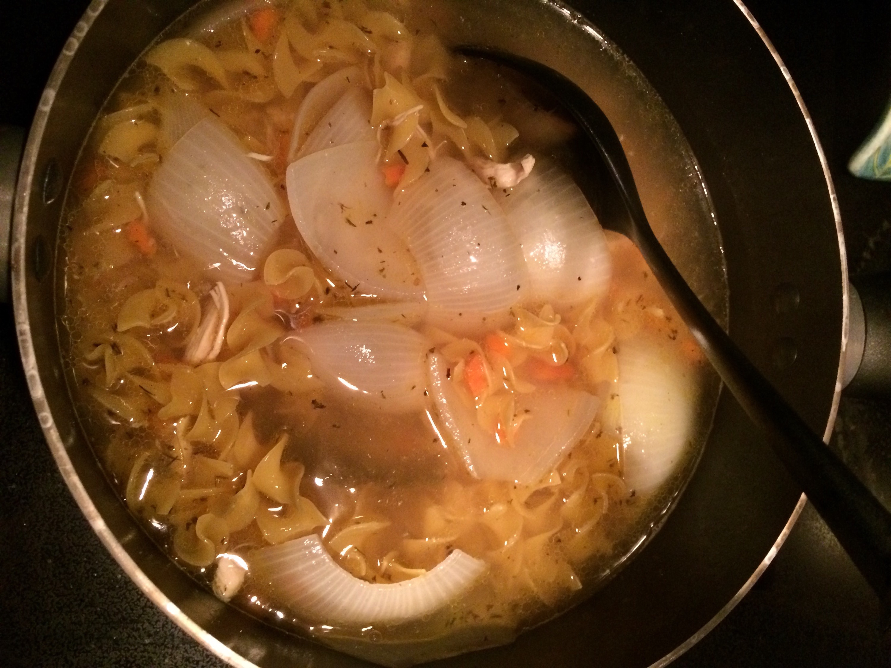 Cook for 10 minutes until noodles are soft.  Discard bay leaves and onions (you didn’t think we were gonna eat those, did you?) and stir in parsley.