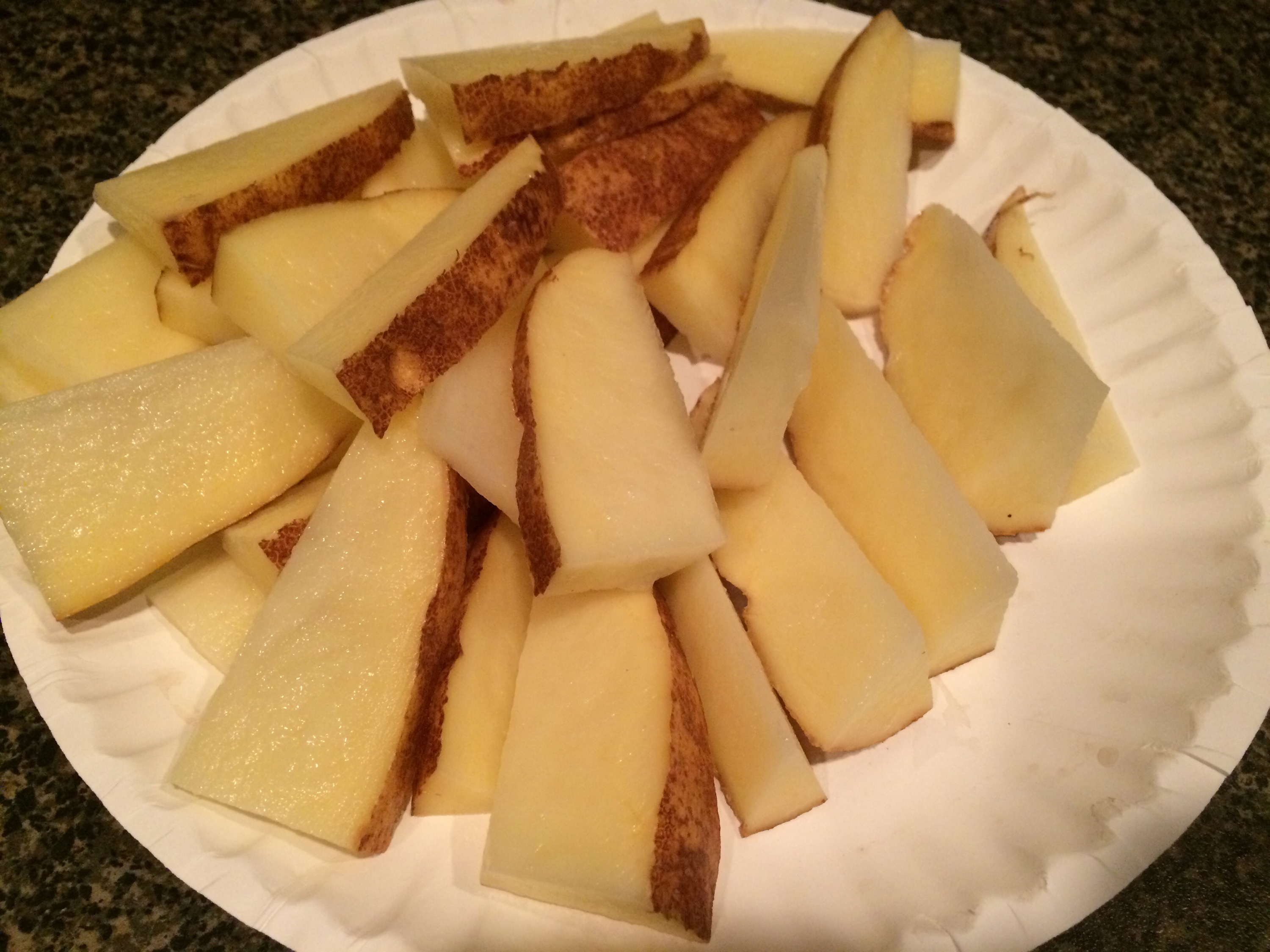 Preheat your oven to 375 degrees. Wash and cut up your potatoes into wedge pieces.