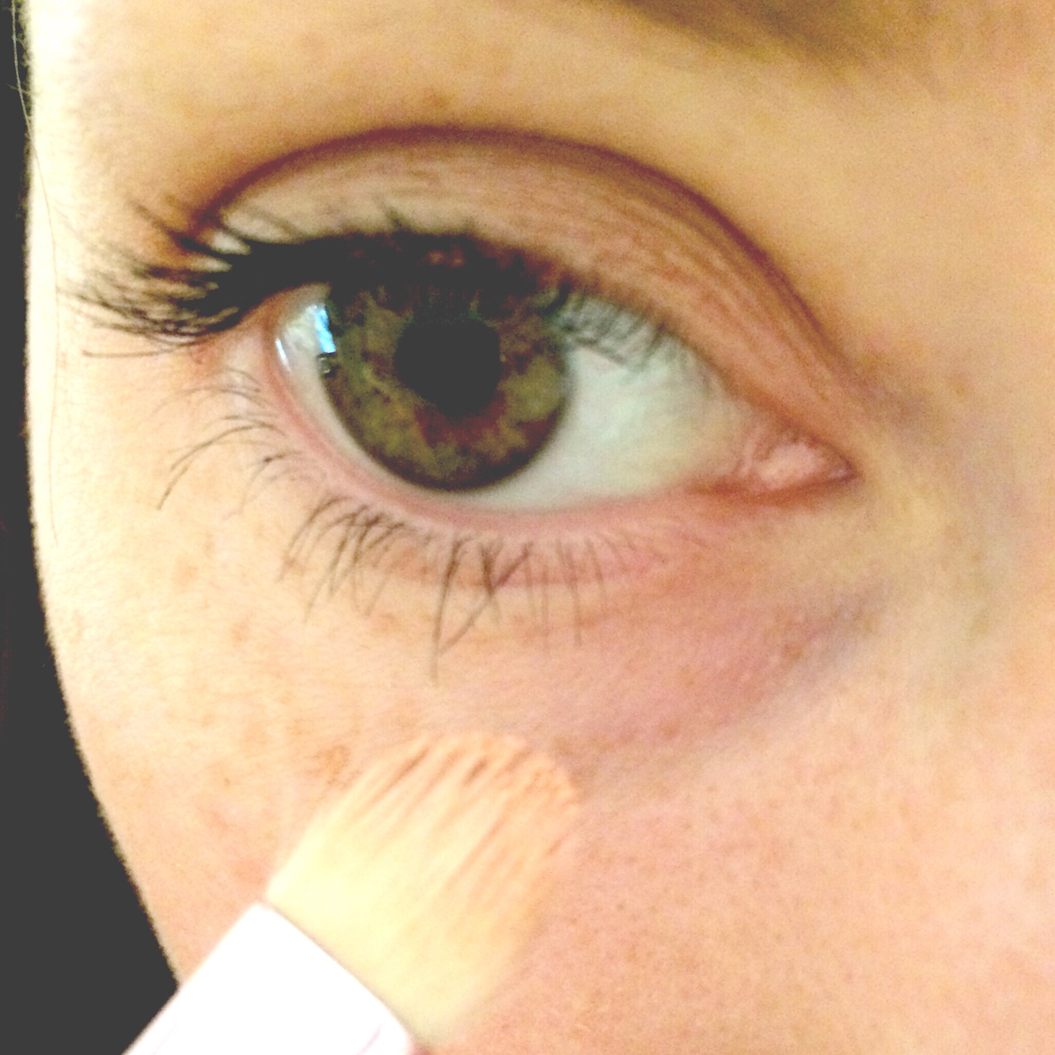 I like to correct the blue tones underneath my eyes with a peachy-pink toned corrector. This one is really good from Pixi, it is their Correction Concentrate in Brightening Peach. This has a cream consistency, but doesn’t feel cakey on my skin. I also love the Maybelline Instant Age Rewind Dark Circle Eraser Concealer in Brightener for this step. I am using a Crown Concealer Brush to gently pat the product underneath my eyes. Any flat brush like this will work; you can even use a shadow brush. I am careful to only put this on the parts of skin that are discolored. This will correct the color and you’ll be ready for concealer!
