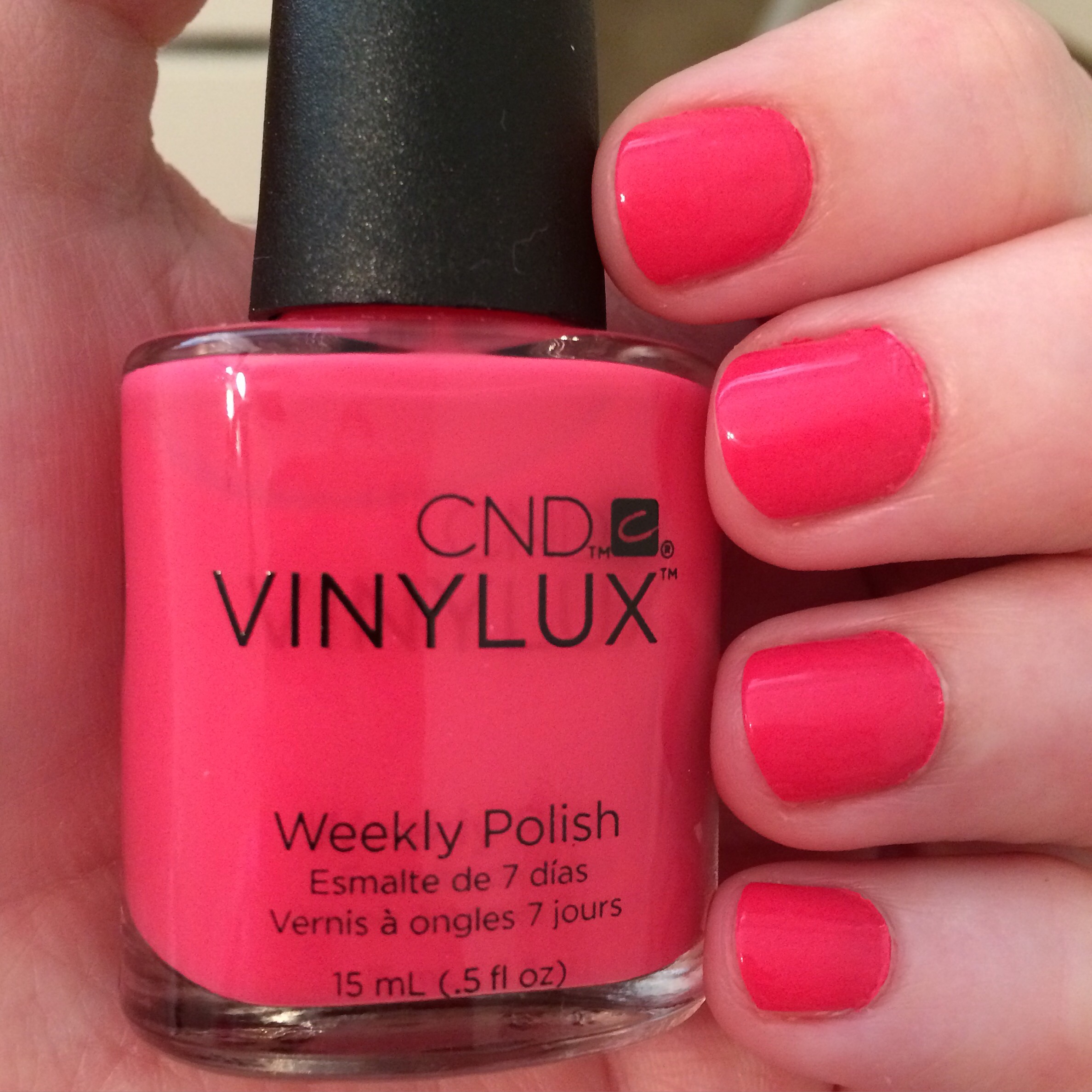 I can’t go to ULTA without grabbing some nail polish, and so I picked up another CND color called Pink Bikini.  Have y’all tried this nail polish brand?  It is the best I’ve ever used!  Lasts at least a FULL WEEK!  I’ve got a review here.  Anyhow, this color is so pretty.  It is a hot pink creme and it reminds me of watermelon and summer.  It is the perfect color for toes, I think!  But, I already put it on my nails, because I CAN’T WAIT.  This is after four days of wear.