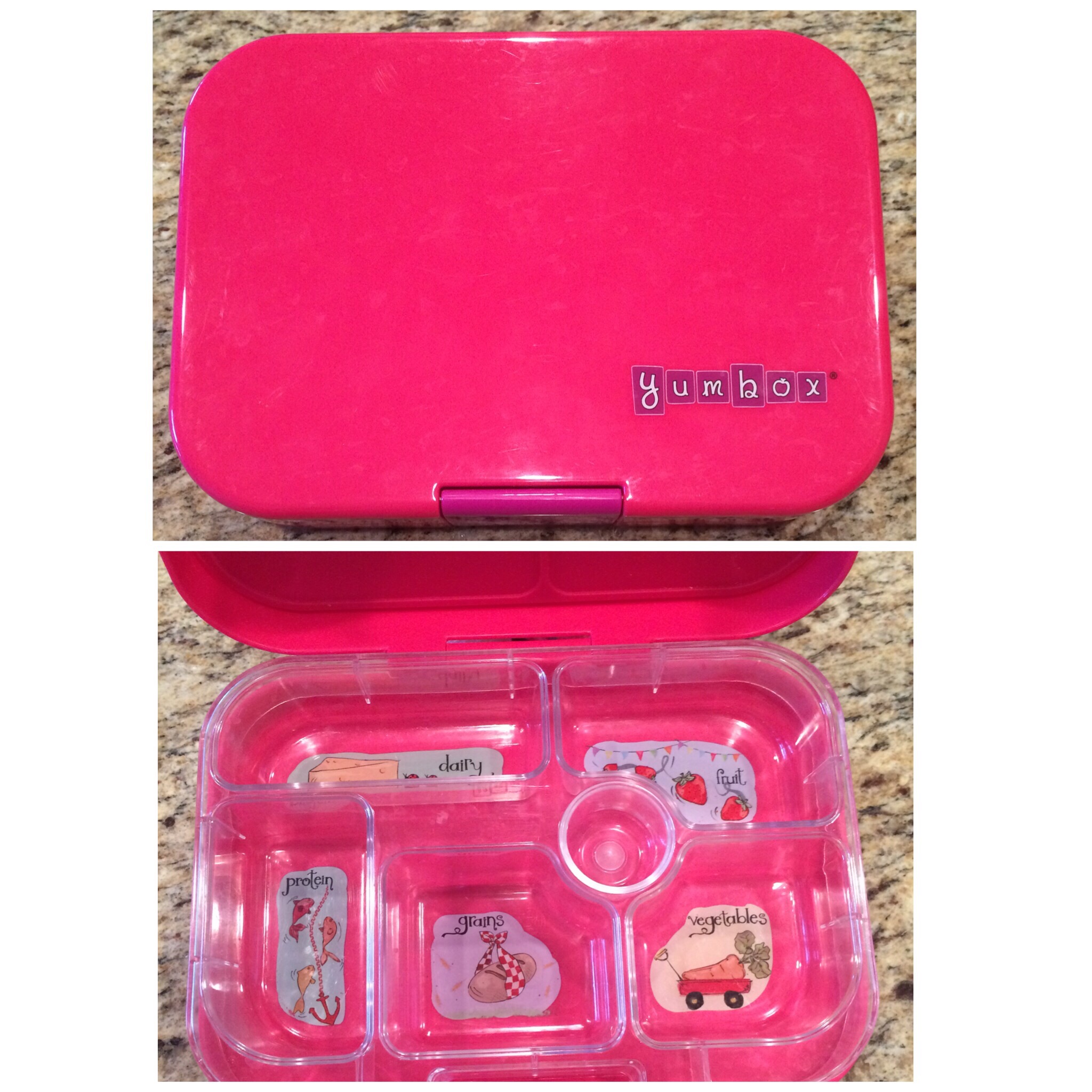 YumBox – this container is hard plastic with a removable, dishwasher safe tray inside.  The compartments are labeled with food groups, and you can have a wide variety of foods in here.