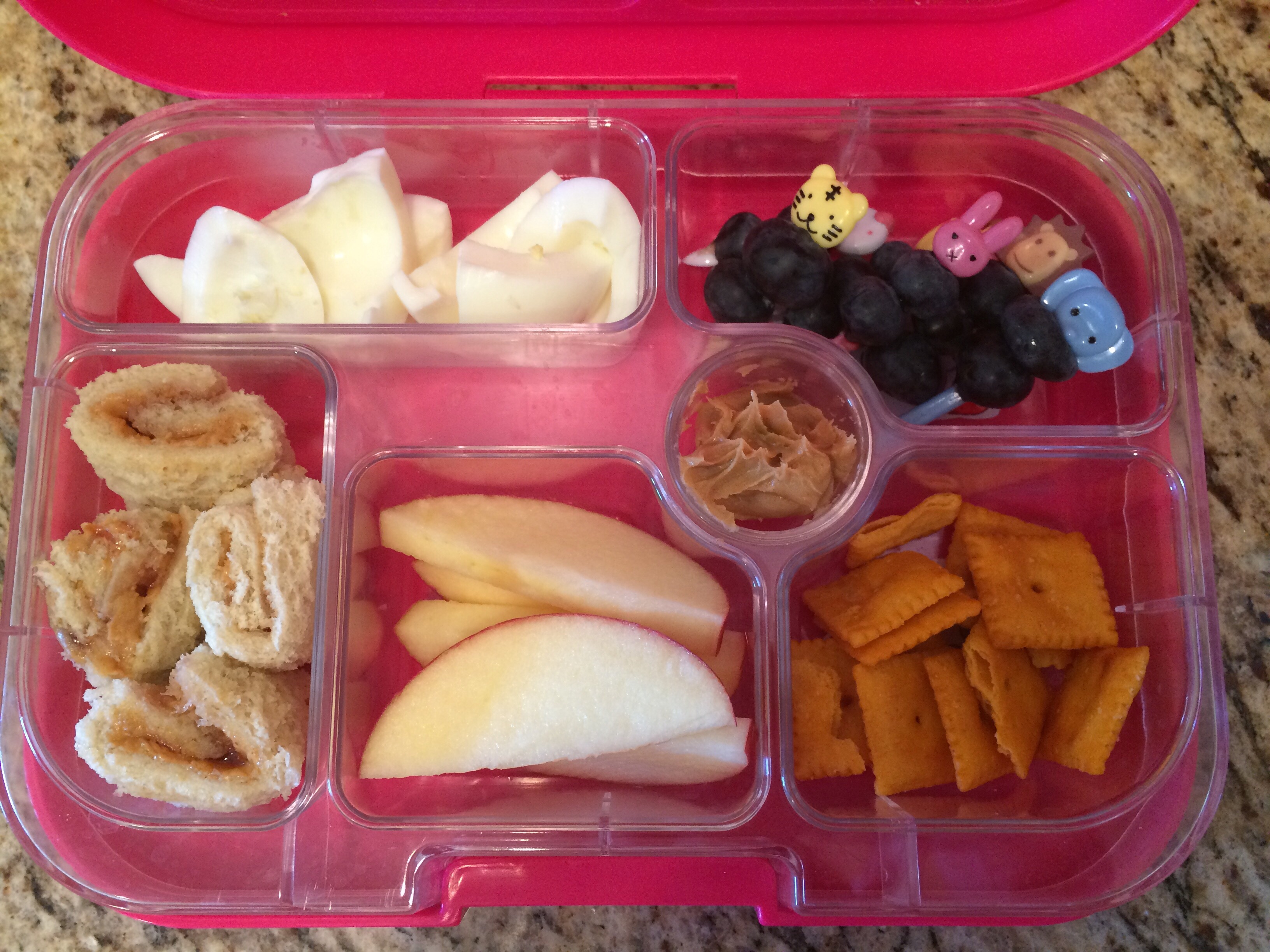 Peanut butter and jelly “sushi” (just take a piece of bread, spread pb&J on it, roll it up and cut it into pieces),  hard boiled egg, blueberries on toothpicks, cheese nips, and apples with peanut butter to dip.