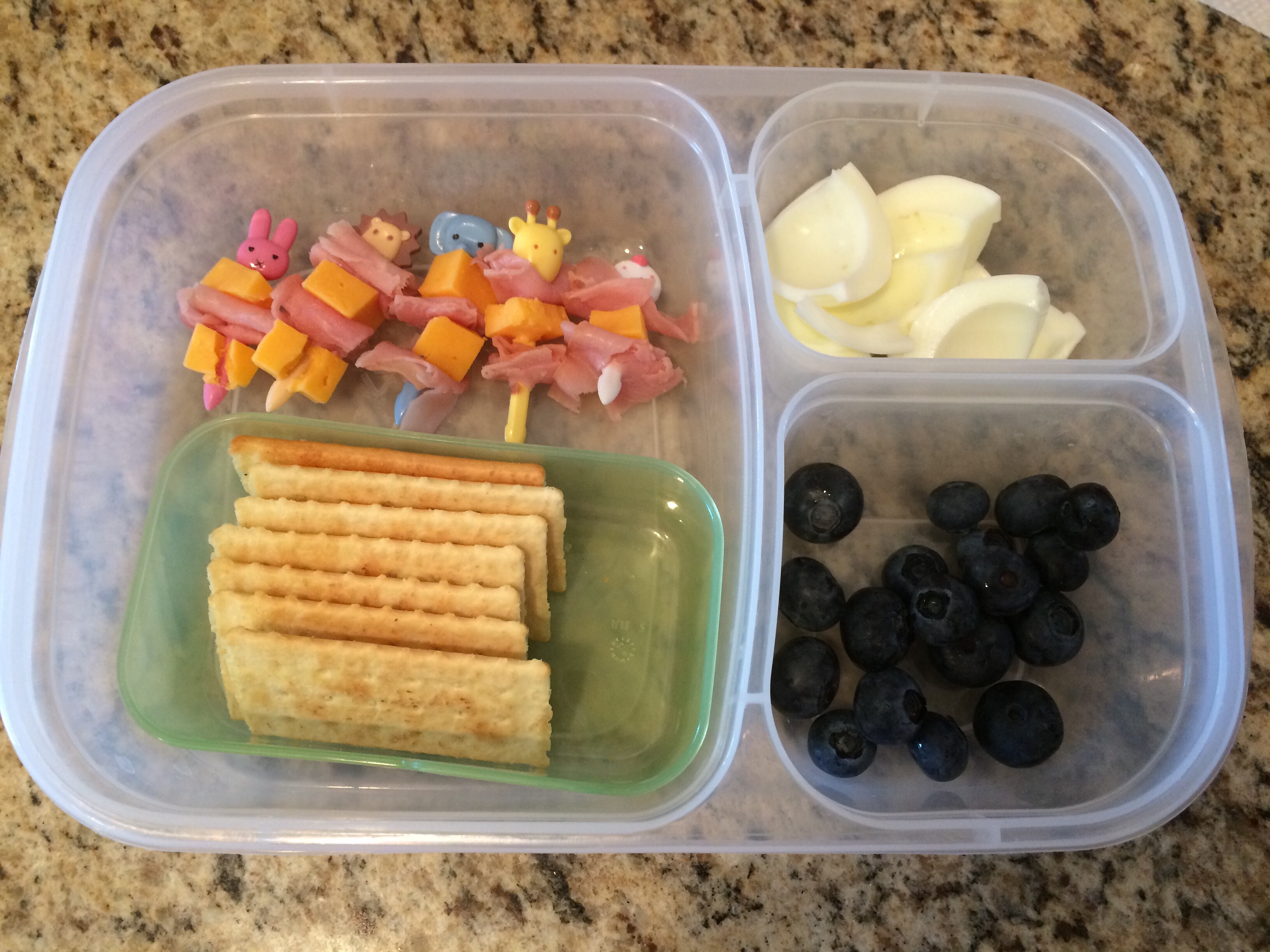 Ham and cheese skewers, crackers, hard boiled egg, and blueberries.