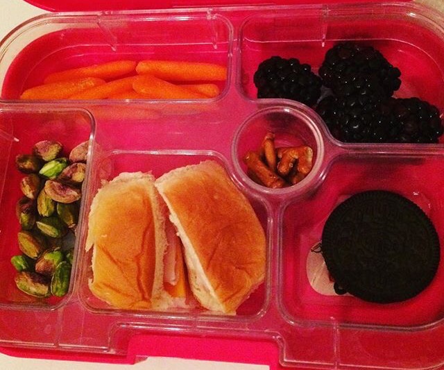 Turkey and cheese sandwich on a Hawaiian roll, pistachios, baby carrots, blackberries, some pretzel letters, and an Oreo.