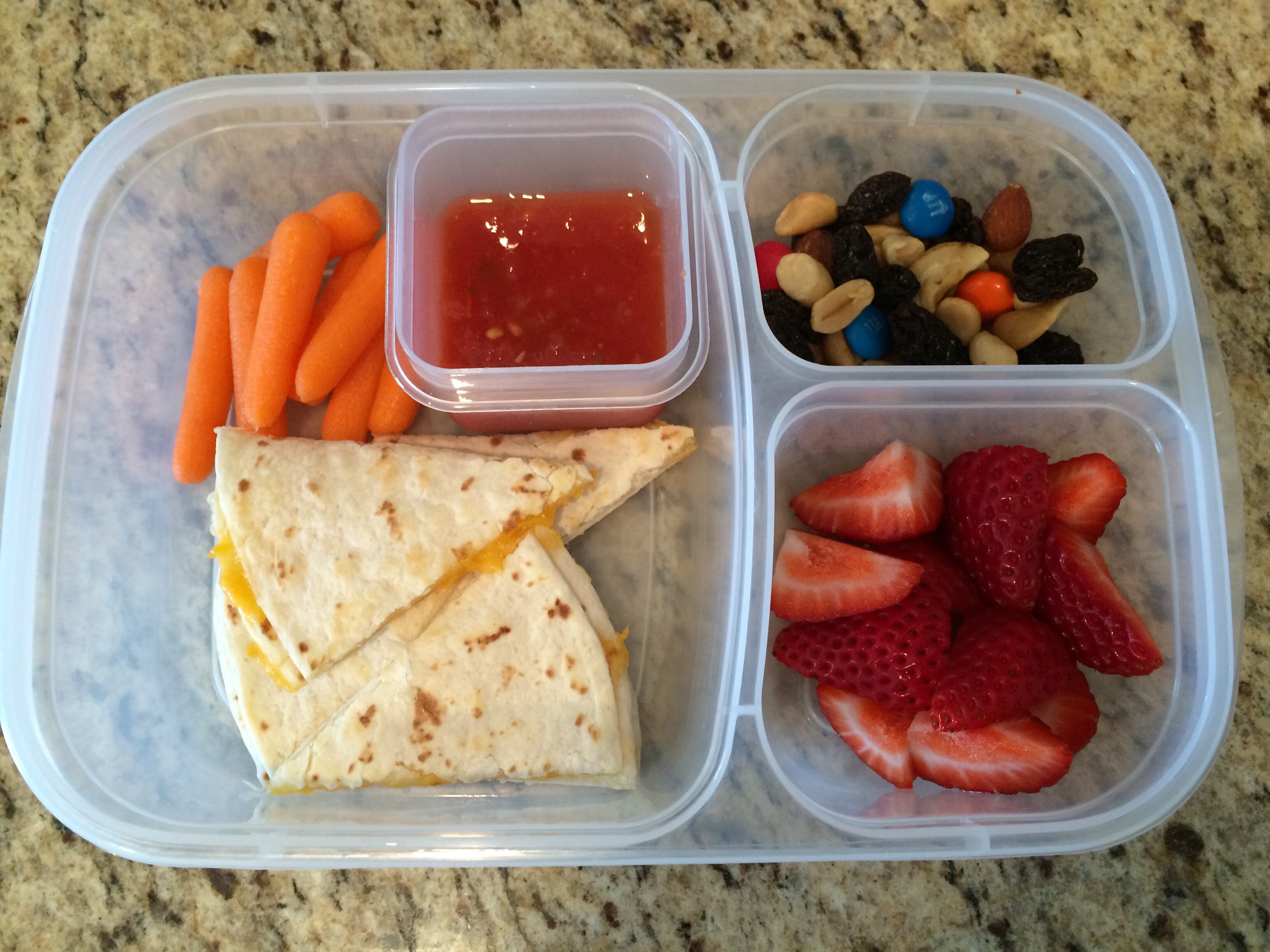Cheese quesadilla with mild salsa for dipping, baby carrots, strawberries, and some trail mix.