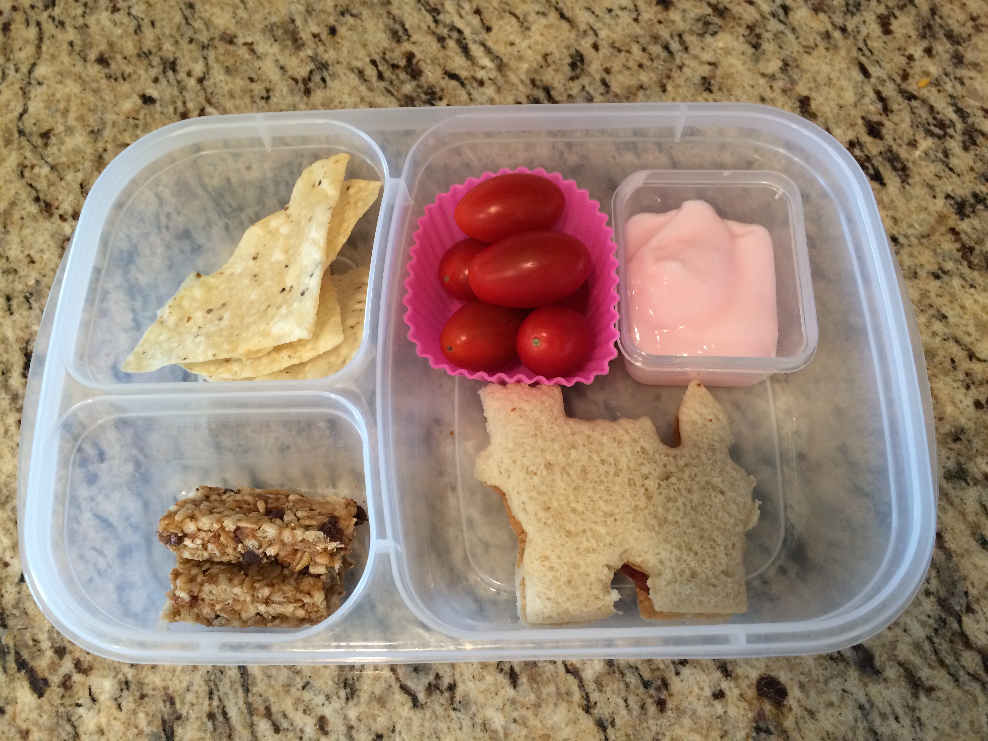 A castle shaped pb&j, some yogurt, cherry tomatoes, a granola bar, and a few tortilla chips.