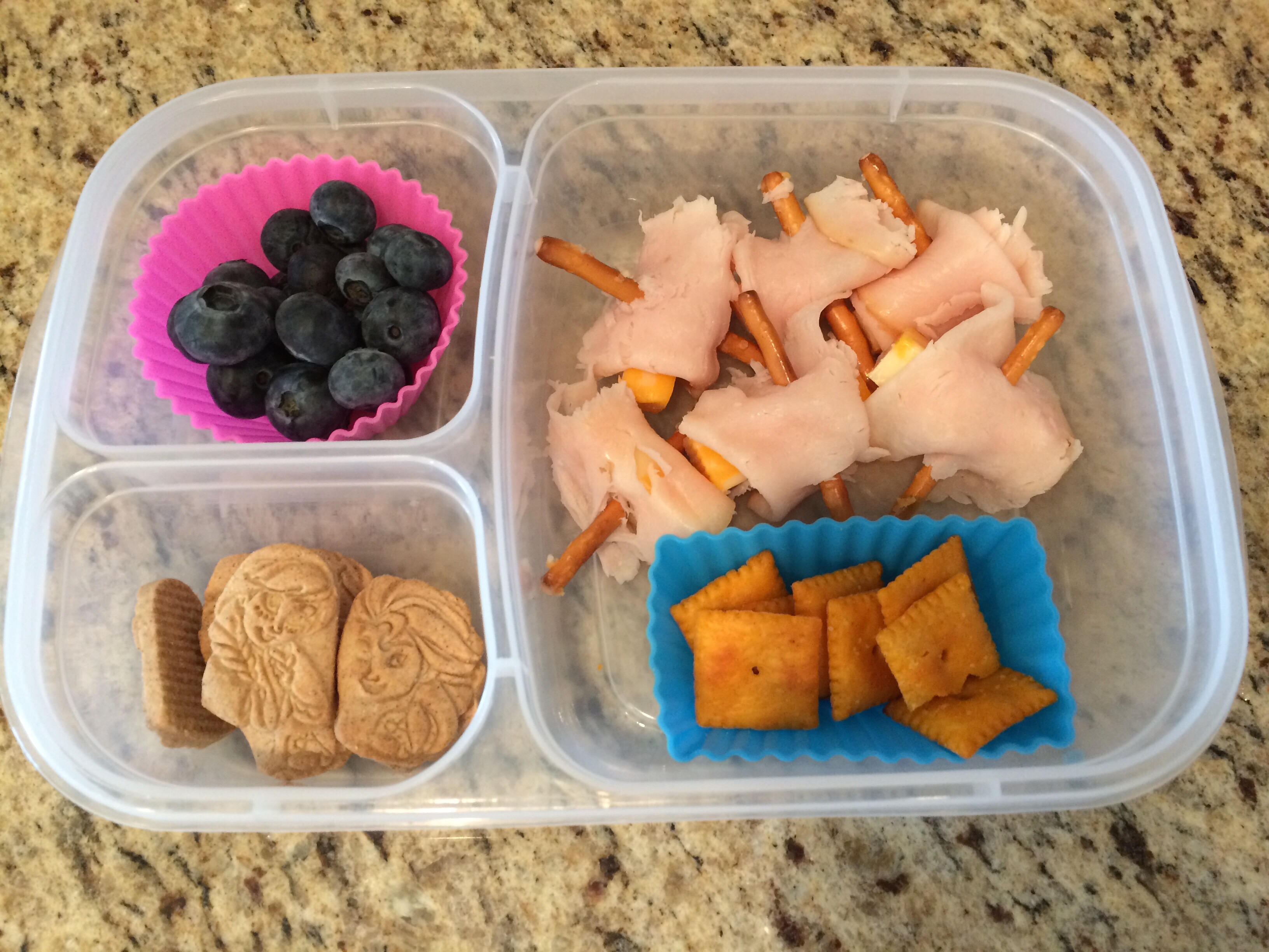 I got some Colby jack cheese sticks, wrapped some turkey around them, and stuck a pretzel stick through to create totally edible little skewers!  I added cheese nips, blueberries, and some Frozen Graham cookies.